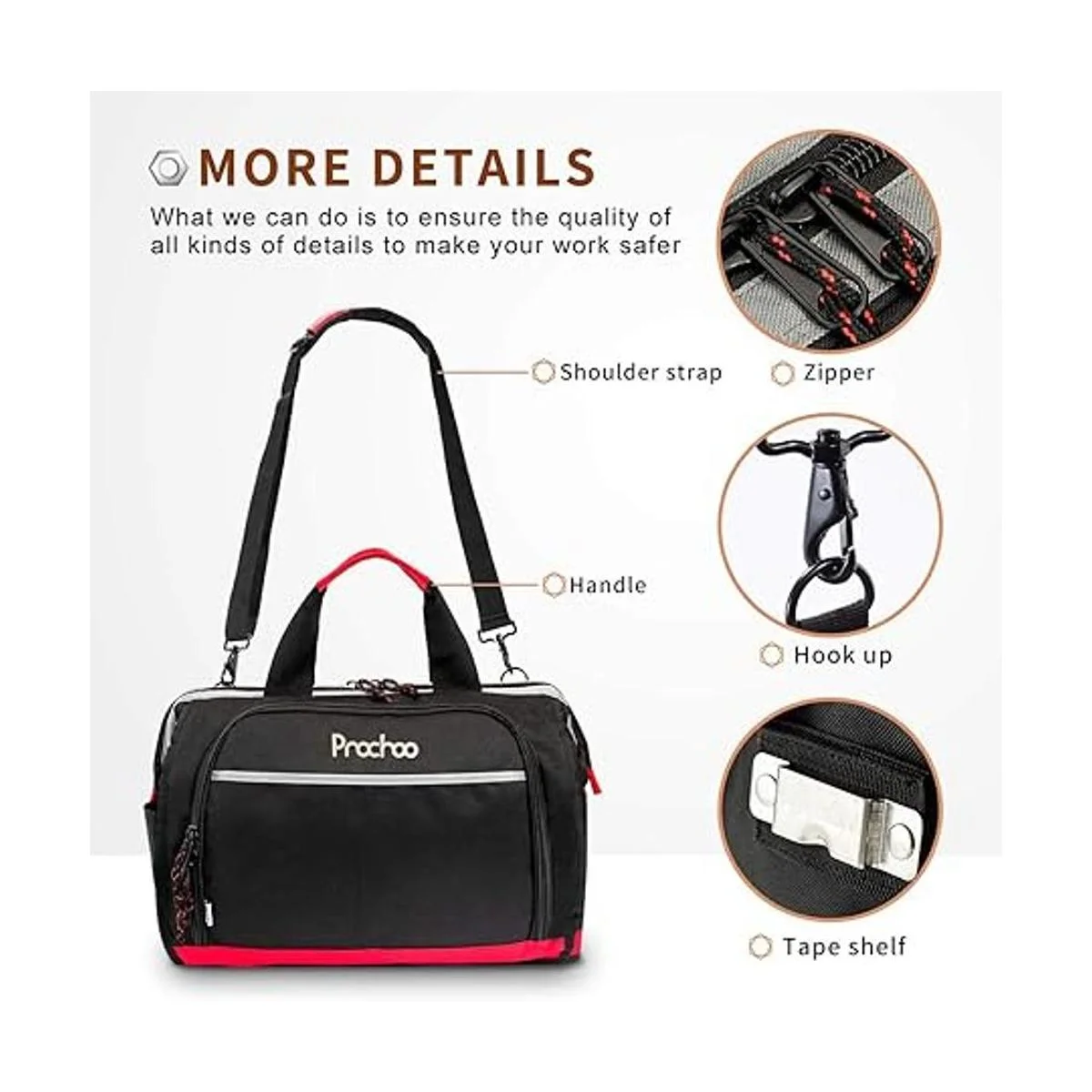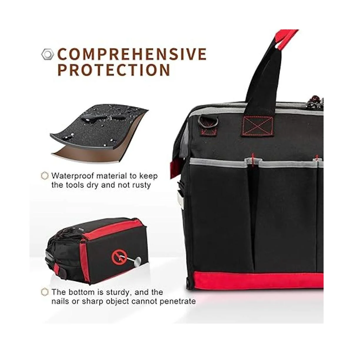 EXCELLENT CRAFTSMANSHIP The craftsmanship of the tool bag is a good stitching effect,making the bag extremely strong and durable. There is no need to worry about the tool bag being damaged or broken during use. The tool bag has a builtin waterproof coating that is wearresistant, scratchresistant and tearresistant .