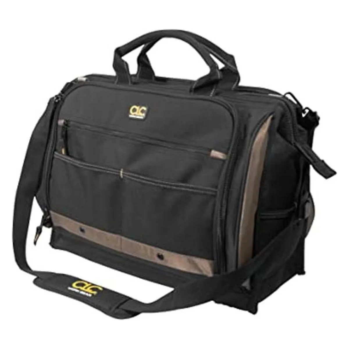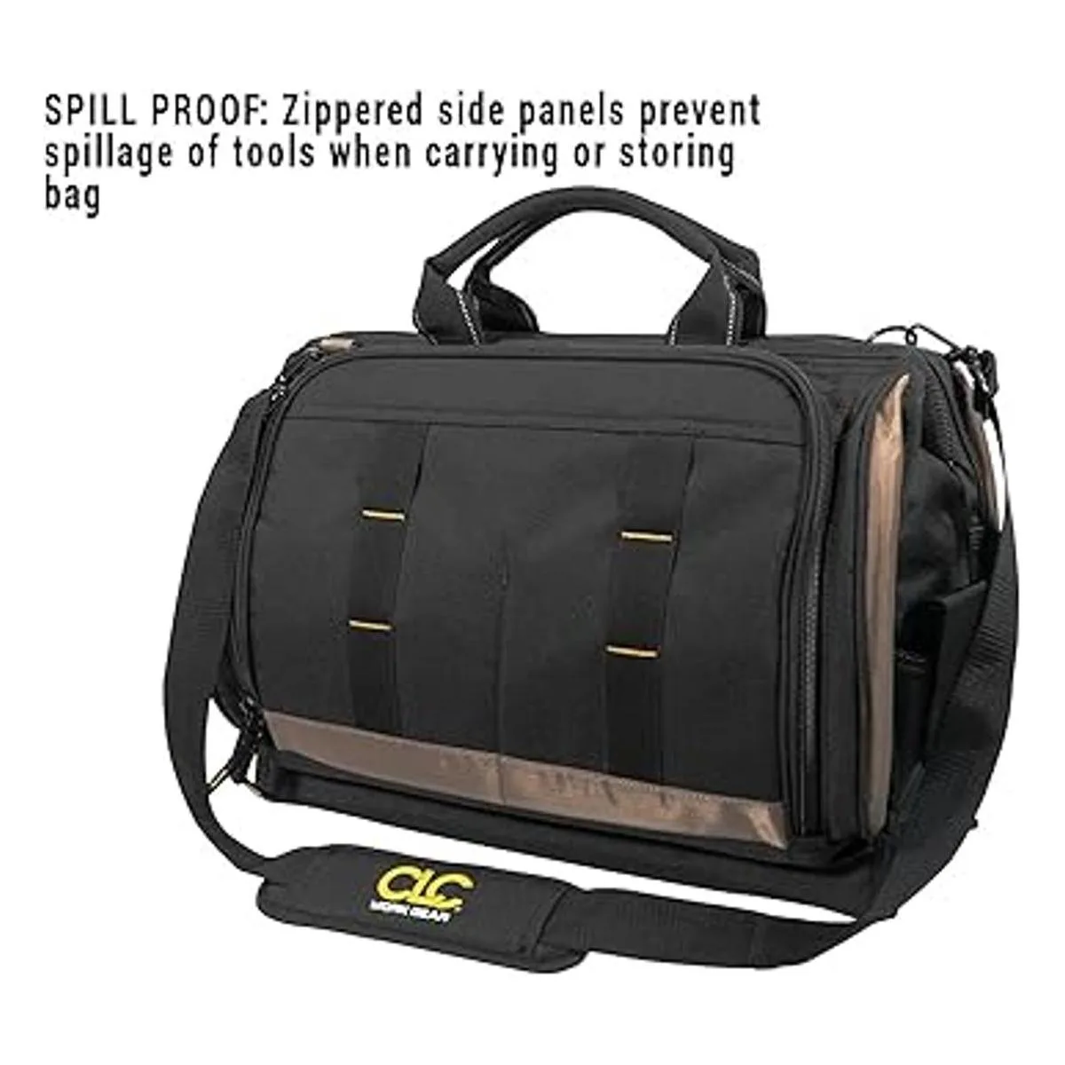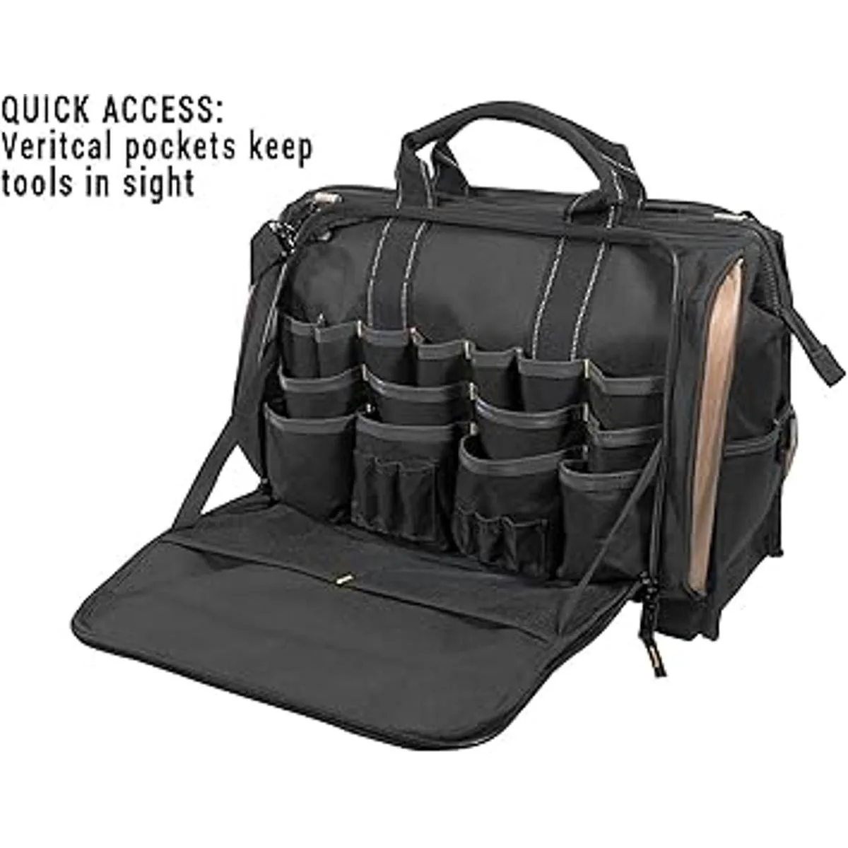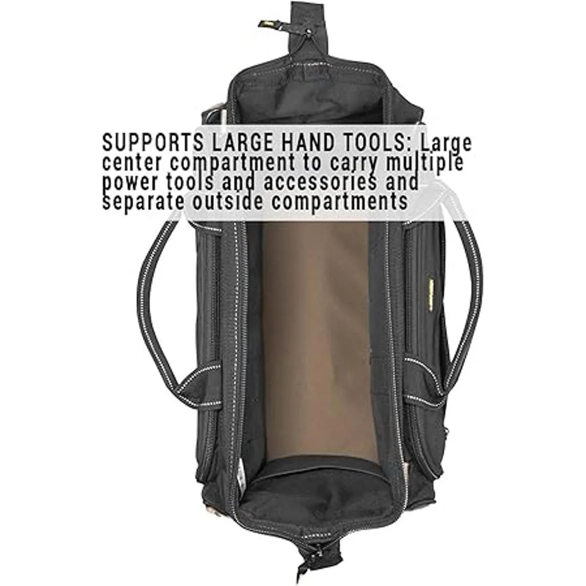 Gran compartimento central para llevar varias herramientas y accesorios de alimentación y compartimentos exteriores.