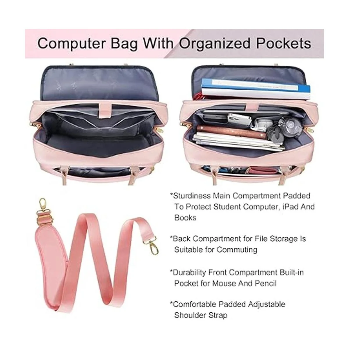 Gran capacidad y compartimento organizado: tamaño: 15.5 x 12 x 5 pulgadas. Compartimento para laptop de bolsa rosa para laptop de 15.6 pulgadas, 14 pulgadas, 15 pulgadas, hasta 16 pulgadas, iPad de 12.9 pulgadas y otros accesorios tecnológicos, compartimento principal para libros, paraguas, botella de agua. Compartimento trasero de la bolsa para portátil para mujer para almacenamiento de archivos adecuado para documentos. Bolsillo multifunción de bolsa de computadora rosa para mujer tiene soportes para bolígrafos y bolsillos para alfombrilla de mouse, banco de energía, auriculares, teléfono celular