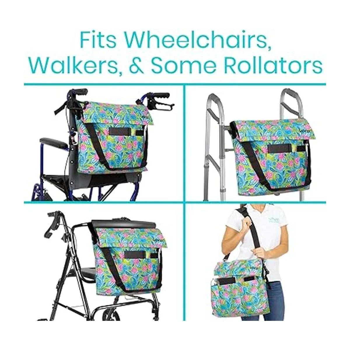 FITS ALL STANDARD WHEELCHAIRS: Durable wheelchair bag attaches with two easily adjustable straps, allowing it to fit on all standard wheelchairs, bariatric wheelchairs walkers and transport chairs.