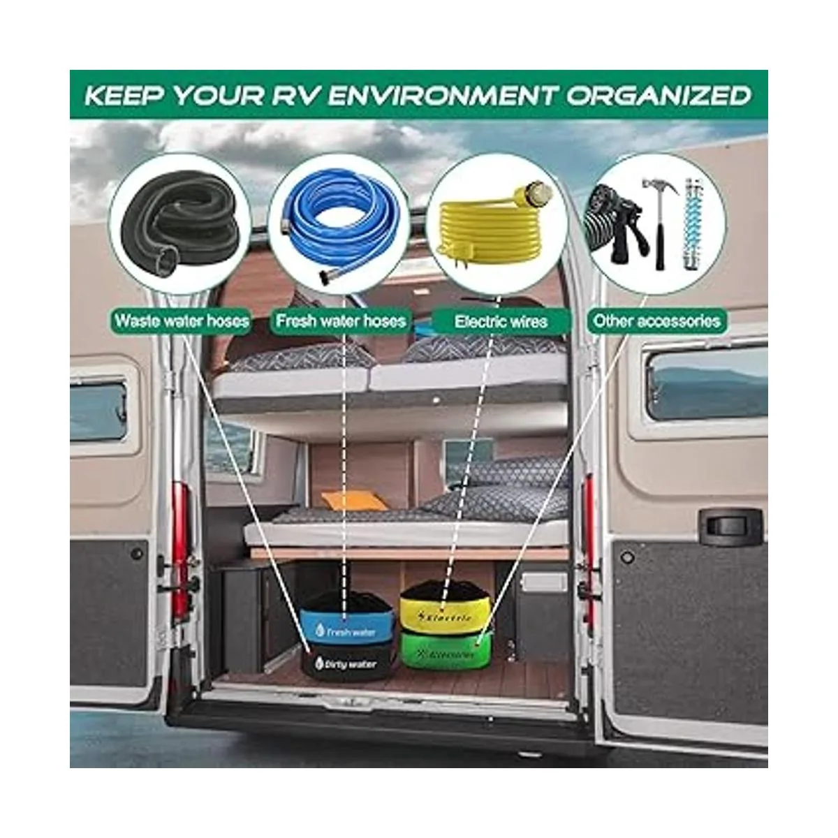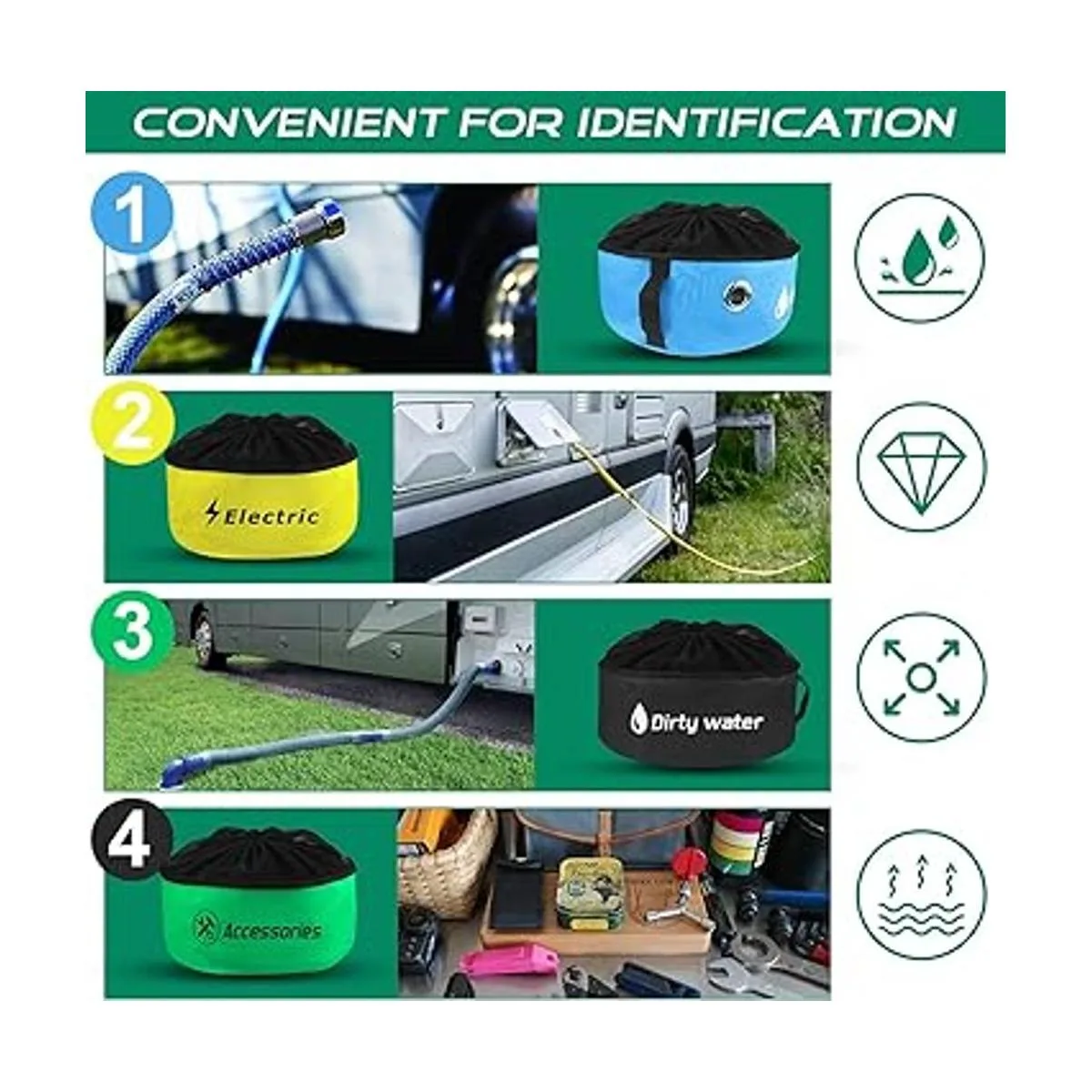 4 colores diferentes de identificación conveniente: si todavía pasas mucho tiempo en organización y almacenamiento de caravanas. Deja que nuestras bolsas de almacenamiento RV sean tu mejor asistente. Las bolsas están en 4 colores diferentes con texto: azul para mangueras de agua dulce, negro para mangueras negras/alcantarillado, y bolsa amarilla para cables eléctricos/cable, verde para mangueras/adaptadores de cables y otros equipos. Puedes almacenar rápidamente los accesorios de caravana para interiores y exteriores en consecuencia después de su uso y obtener rápidamente el correcto cuando lo necesites.