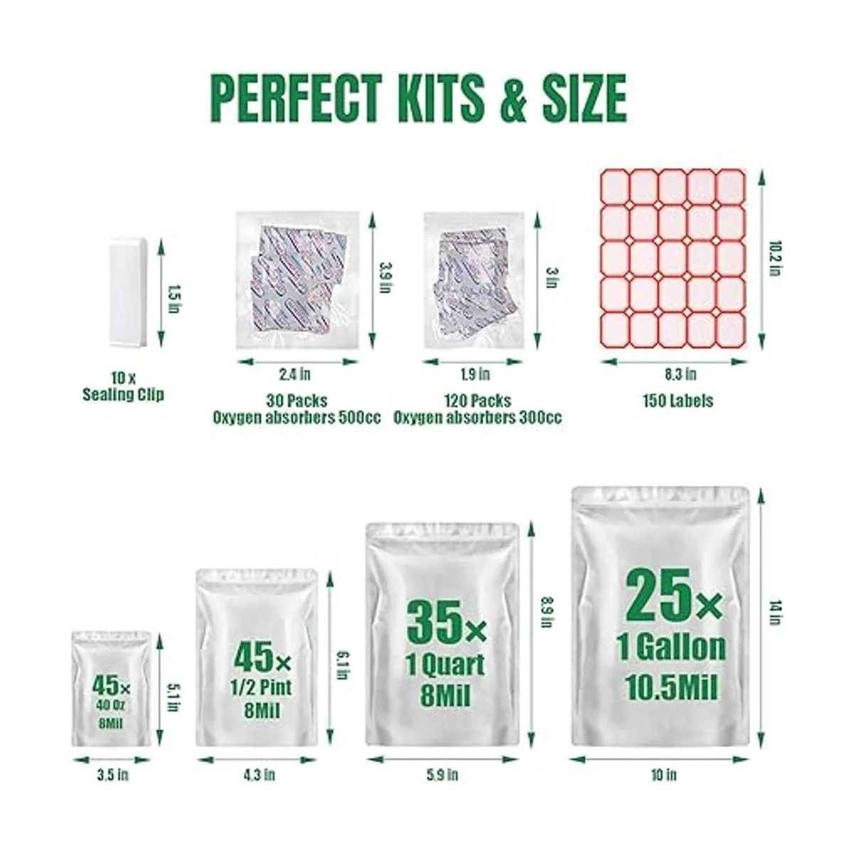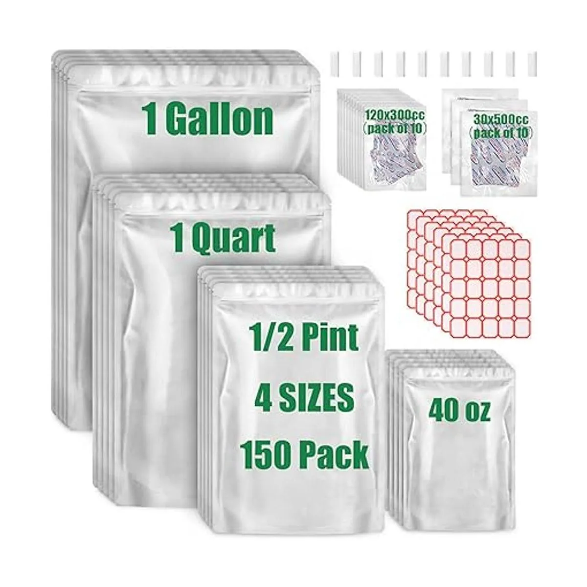 150 piezas y 4 tamaños 150 bolsas de mylar para almacenamiento de alimentos con absorbentes de oxígeno, el juego incluye 4 tamaños: bolsas de mylar de 1 galón de 10.5 mil 30 piezas, bolsas de mylar de 8 mil de 1/2 pinta 45 piezas, mylar de 8 mil, 40 onzas bolsas 30 PC. Viene con 30 x 500 cc paquete de 3 x 10 y 120 x 300 cc paquete de 12 x 10 absorbentes de oxígeno sellados individualmente, 150 etiquetas y 10 clips, adecuado para una amplia gama de almacenamiento de alimentos.