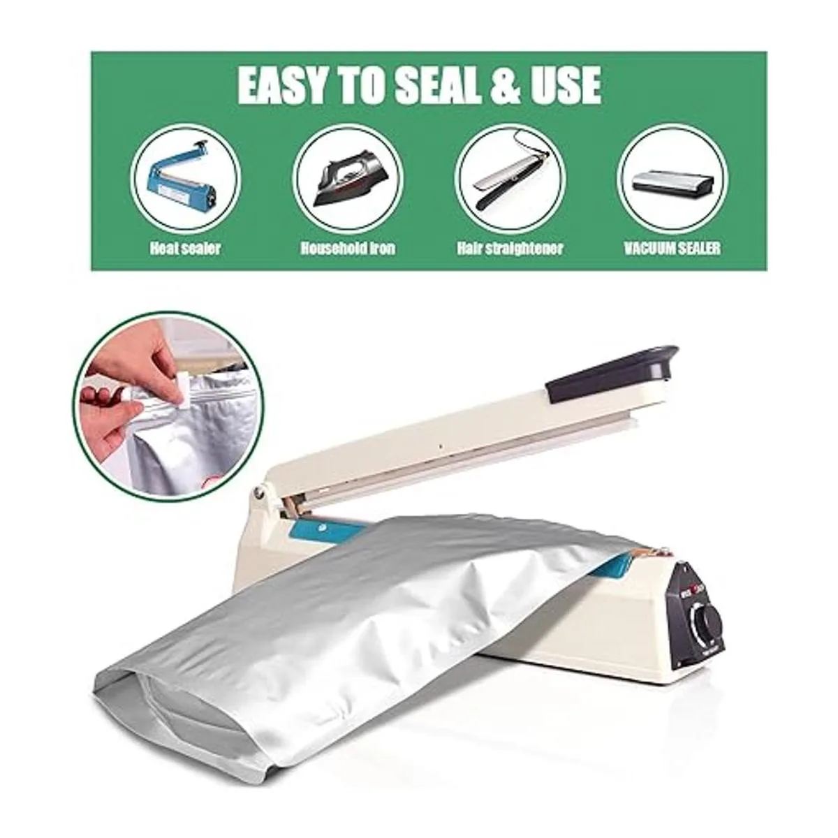 Fácil de usar y sellar: las bolsas de almacenamiento de alimentos de mylar con cremallera se pueden utilizar repetidamente. Sellado térmico con sellador al vacío, alisador de pelo o plancha caliente cuando necesites almacenar alimentos durante más tiempo. El kit proporciona dos tamaños diferentes de absorbentes de oxígeno sellados individualmente, 500 cc y 300 cc, que encajan perfectamente en 4 tamaños de bolsas de mylar, asegurando que cada absorbente de oxígeno se utilice al máximo efecto y evitando residuos.