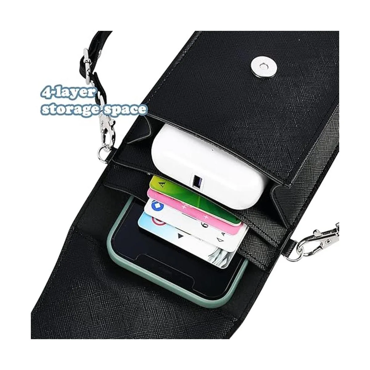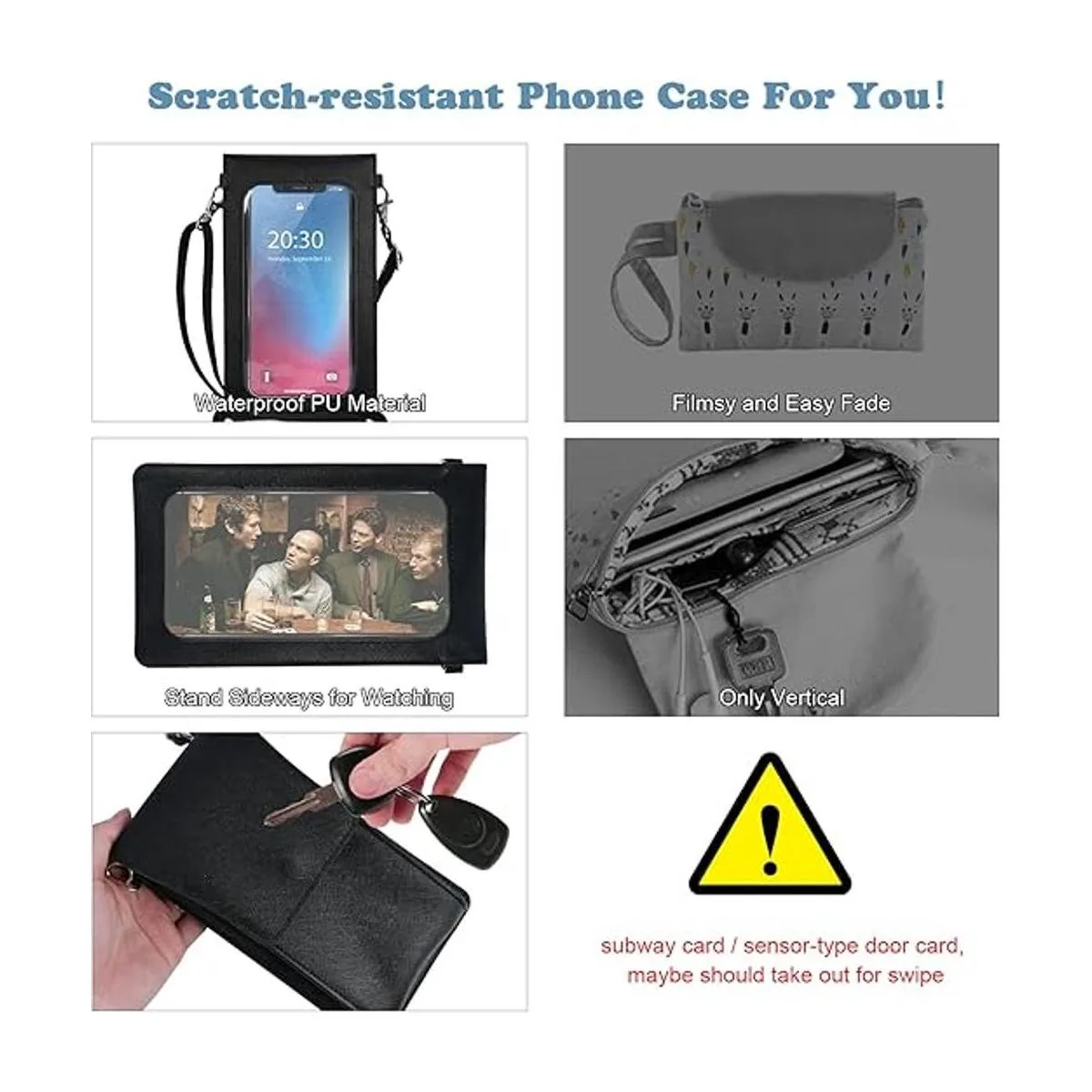 Consejos para la bolsa cruzada para teléfono: 1 mide el tamaño de tu teléfono con la funda antes de comprar. 2 La tarjeta Metro / tarjeta de puerta sin contacto puede ser sacada. 3 Si el agua entra en la superficie de la pantalla táctil o calor excesivo, la película de la pantalla táctil se adhiere a la pantalla del teléfono, utiliza polvo suelto para reducir la adherencia. Gran capacidad propicia la ventilación del teléfono móvil y evita la generación de calor.