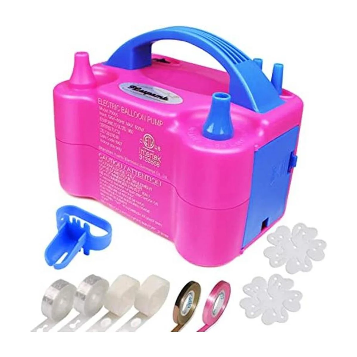 Bomba de globo, bomba de globo eléctrica, doble boquilla portátil, bomba de aire eléctrica de globo de 110 V 600 W, inflador eléctrico de globos con herramienta de atar, clips de flores, tiras de cinta, pegamentos de puntos para decoración de fiestas
