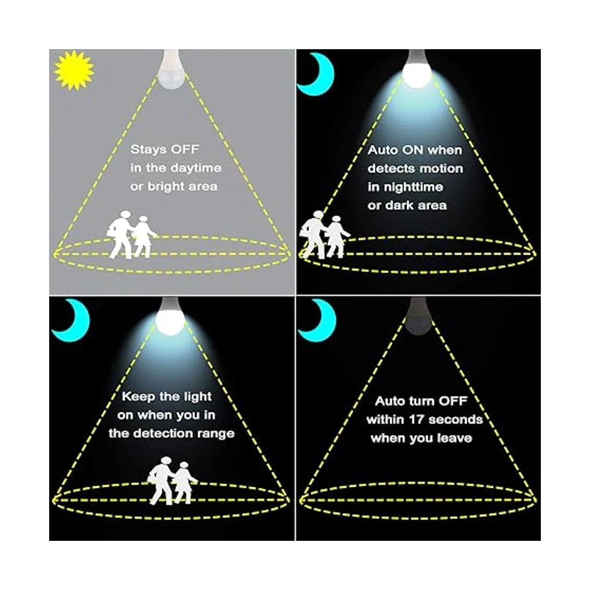 Bombillas LED del atardecer al amanecer: el sensor de fotocélula sensible desactivará la bombilla LED del sensor de movimiento durante la luz del día y activará la detección de movimiento por la noche para ahorrar energía. Nota: no te preocupes si encuentras que la bombilla está encendida durante el día cuando se enciende por primera vez. Se apagará después de unos 17 segundos cuando no se detecte movimiento
