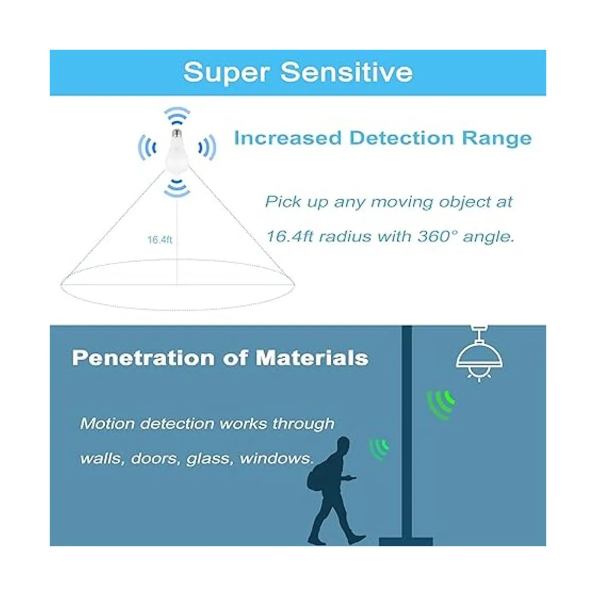 Bombilla con detector de movimiento de radar: en comparación con la bombilla tradicional infrarroja PIR con sensor de movimiento, la bombilla con sensor de movimiento de radar de 4.0 GHz fue más sensible y una penetración más fuerte para proporcionar capacidad de detección de movimiento de 360 grados con un rango de 20 pies. Ya no tienes que preocuparte por buscar interruptores y las bombillas del sensor se encenderán automáticamente cuando estés en el rango de detección y luego se apagarán automáticamente si no se detecta movimiento adicional en 17 segundos.