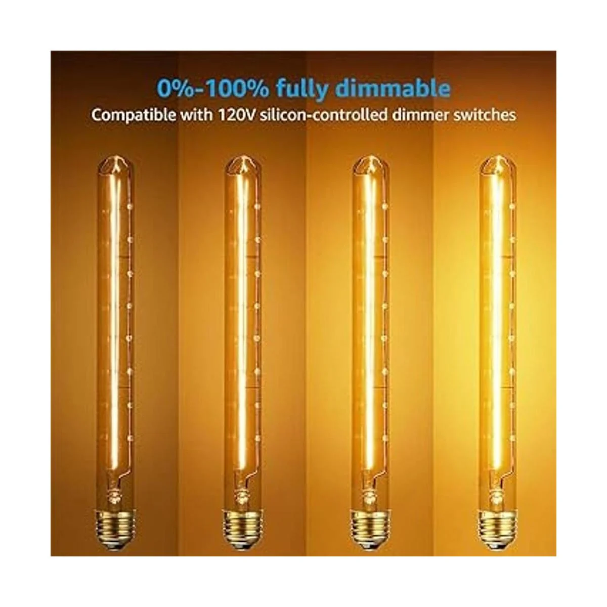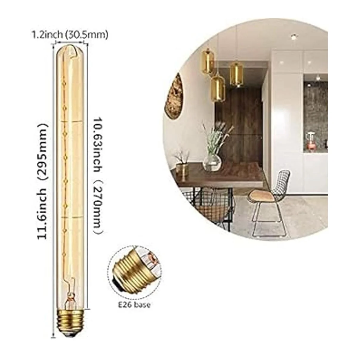 Especificaciones: T3004 paquetes40w base de tornillo E26 Regulable3000 horasamarillo cálidoámbar vidrio transparente Diámetro: 1.2 pulgadas y alto: 11.6 pulgadas. Dimensiones del paquete: 2.9 x 2.9 x 12.2 pulgadas.