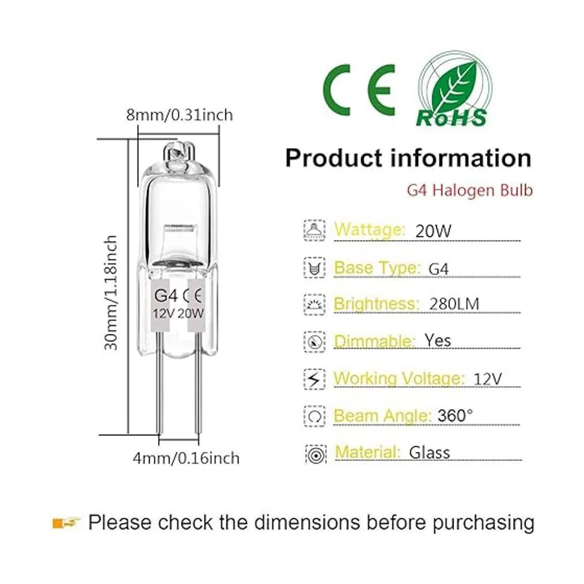 Ahorro de energía de alta salida: bombilla halógena G4 de 20 W, 280 lúmenes, costos promedio de energía del hogar es de 2.4 al año. Consejos importantes: esta bombilla solo se utiliza para 12 voltios CA/CC, por favor, no se utiliza para 120 voltios.
