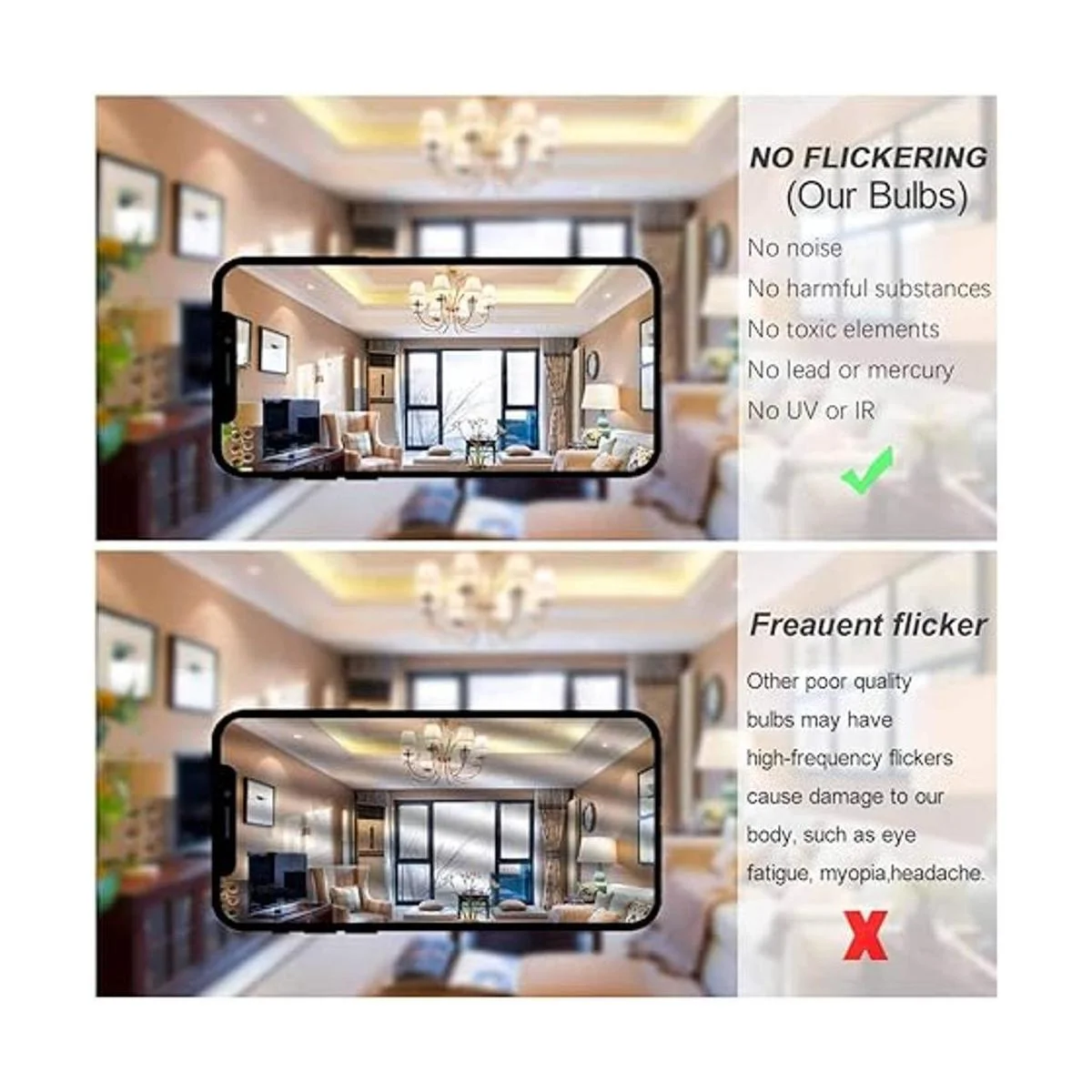 Sin parpadeo y sin ruido: la última tecnología LED avanzada elimina el parpadeo y el ruido de nuestras bombillas, reduciendo el sufrimiento de algunos problemas de salud como el agotamiento de los ojos, la migraña y así sucesivamente, que podría ser causado por luces parpadeantes y el ruido de bombillas de mala calidad.