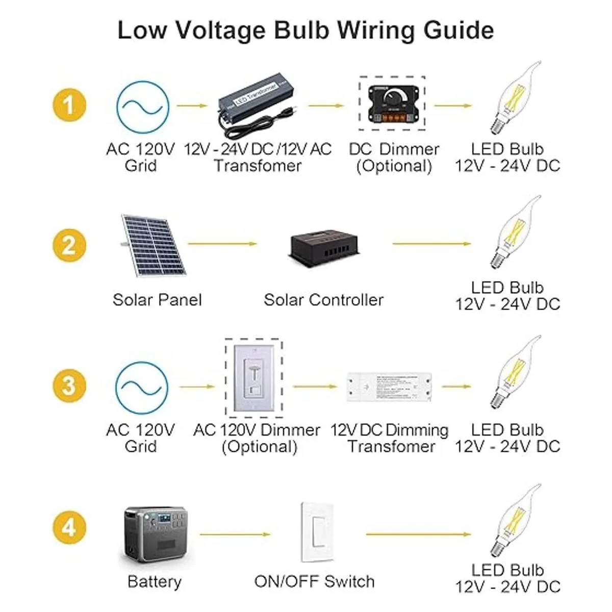 Bombilla LED de bajo voltaje de 12 V 24 V con base E12, punta de llama, equivalente a 40 W, luz diurna blanca, 5000 K, 4 W, 12 voltios, bombillas LED para paisaje, RV, cámper, barco marino, baterías solares, paquete de 4