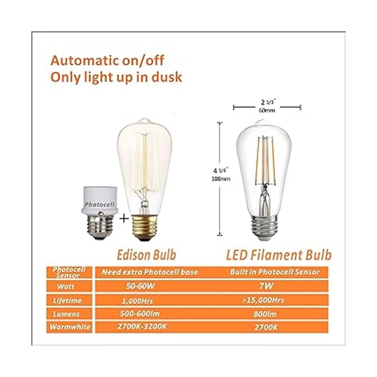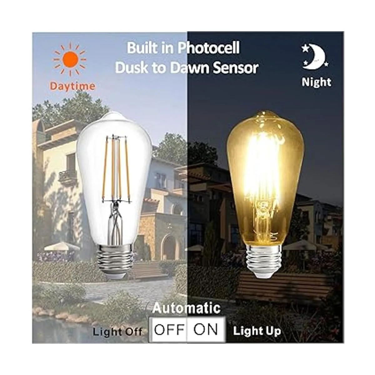 Bombilla LED de Dusk to Dawn con sensor de fotocélula y encendido automático, ST58 ST19 60 W Edison reemplazo, E26 8W 800 lm, blanco cálido 2700 K para iluminación de pared al aire libre, jardín, garaje, porche, paquete de 2