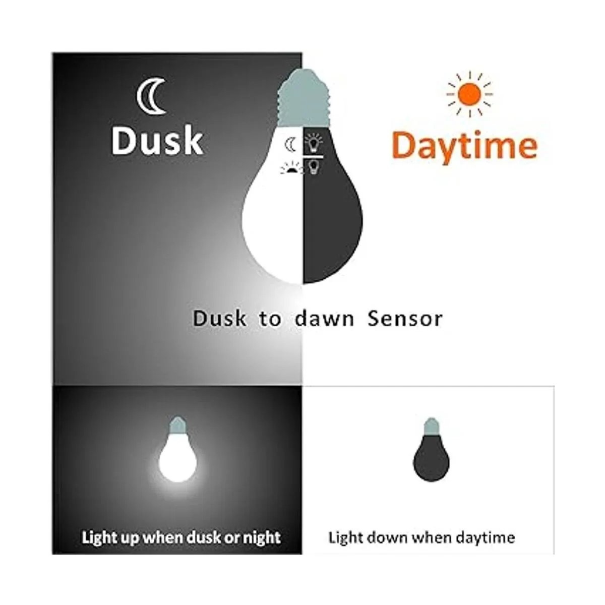 Piezas invisibles de sensor de luz incorporadas, no verás ningún componente adicional, aspecto agradable y misma forma que la bombilla tradicional, las piezas de sensor integradas no requieren ninguna dirección de instalación para detectar la luz, más conveniente para diferentes fijaciones: porche, garaje, patio, pasillo, puerta delantera.