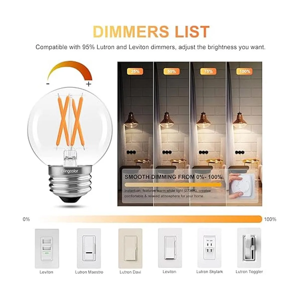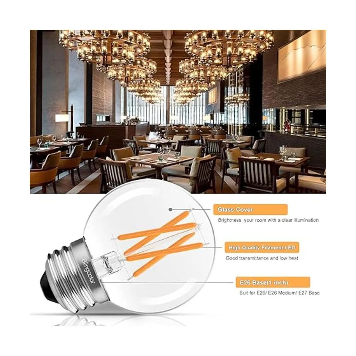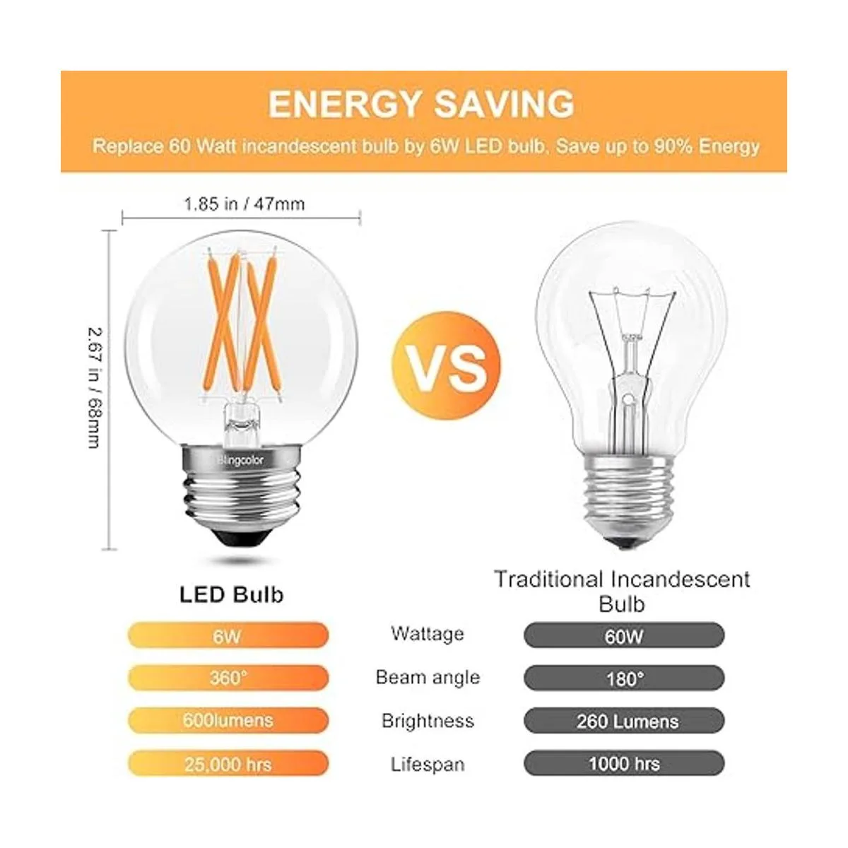 Paquete de 6 bombillas LED E26 equivalente a 6 W y 60 W. Recibirás 6 bombillas E26 6 W igual a 60 W, forma de globo G50 Diseñado con voltaje universal de 120 V y base estándar E26, ángulo de haz de 360, iluminando tu habitación sin ninguna oscuridad. 600 lúmenes, temperatura de color blanco cálido de 2700 K, ofrece un ambiente cómodo y relajante.