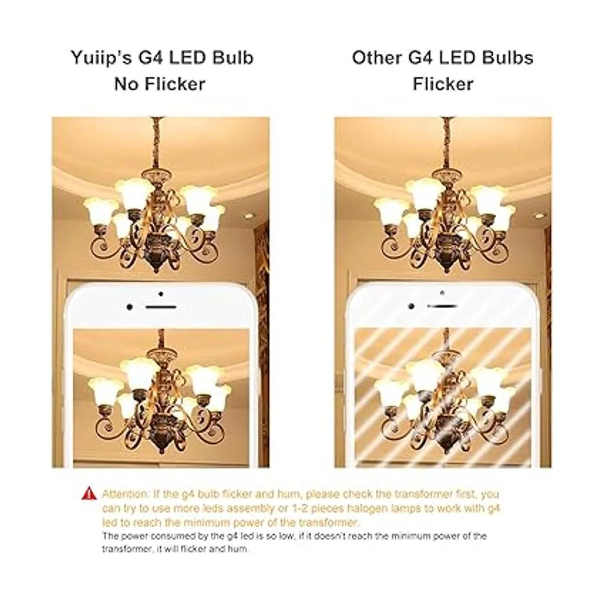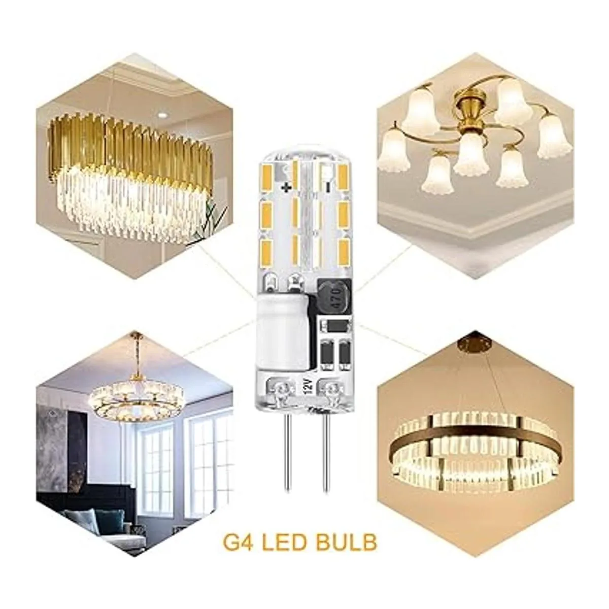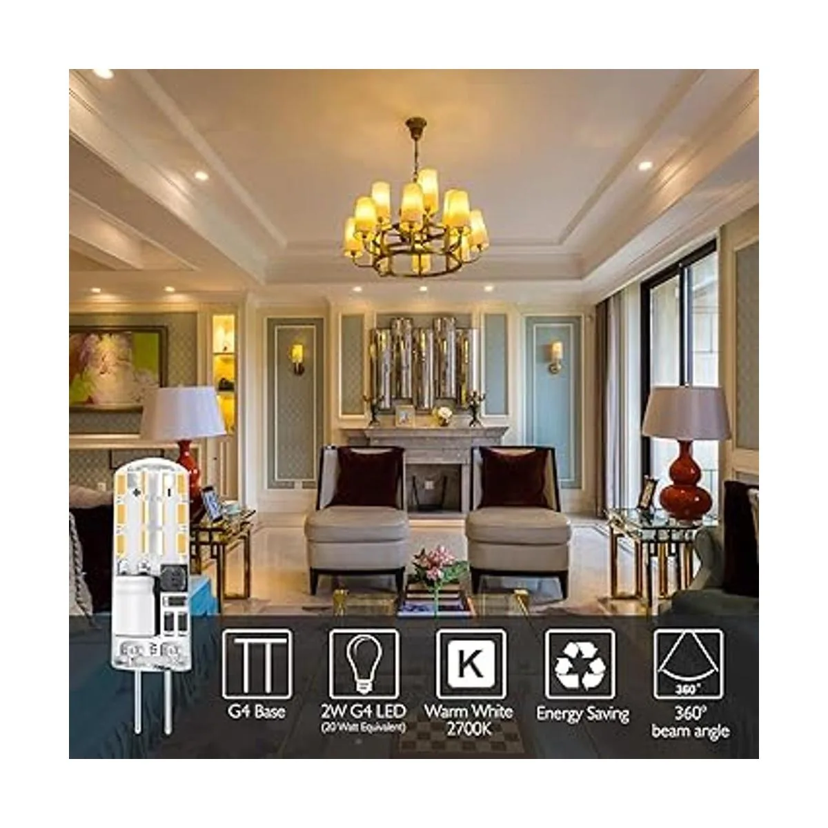 Alto rendimiento: LED G4 CA/CC 12 V 2 W CA/CC, ángulo de haz omnidireccional de 360 grados, blanco suave de 2700 K emite luz blanca cálida sin parpadeo ni zumbidos. Resistente a la presión, al calor y a los impactos