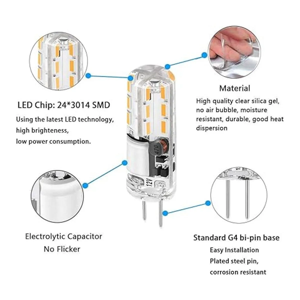 Calidad prémium: esta bombilla LED G4 de 12 V está bien protegida en material de silicona suave y cerámica integrada resistente al calor, bajo calor, larga vida útil, más segura que la bombilla halógena o xenón.