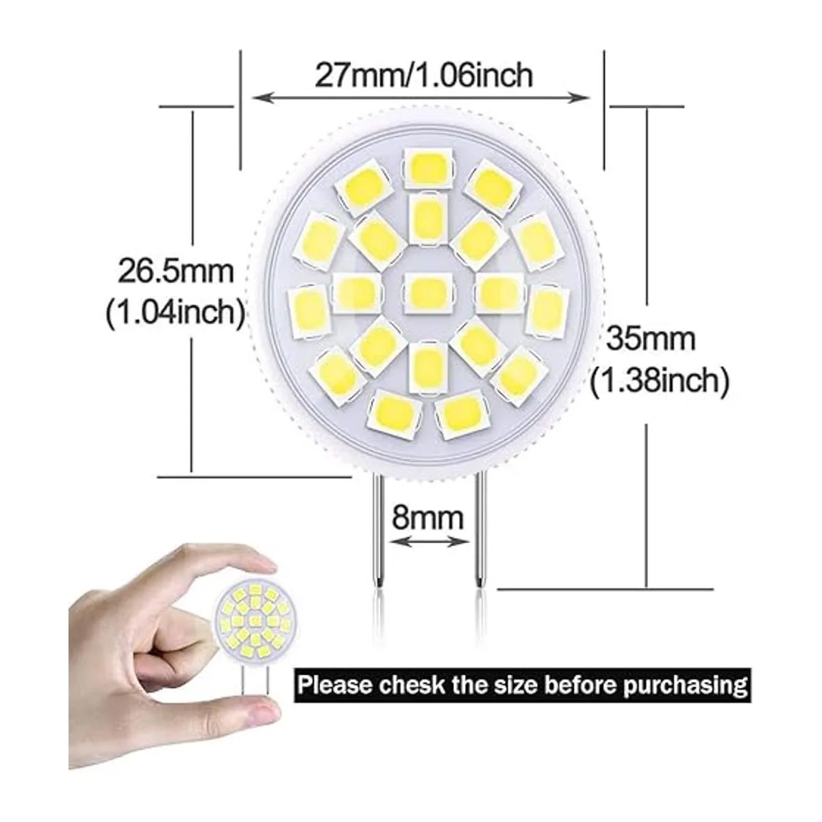 1 Especificaciones de la bombilla: bombilla LED G8, Kelvin: 6000 K, Potencia: 3.5 W equivalente a bombilla halógena de 35 vatios, lúmenes: 320 lm, 20 LED x 2835 SMD.