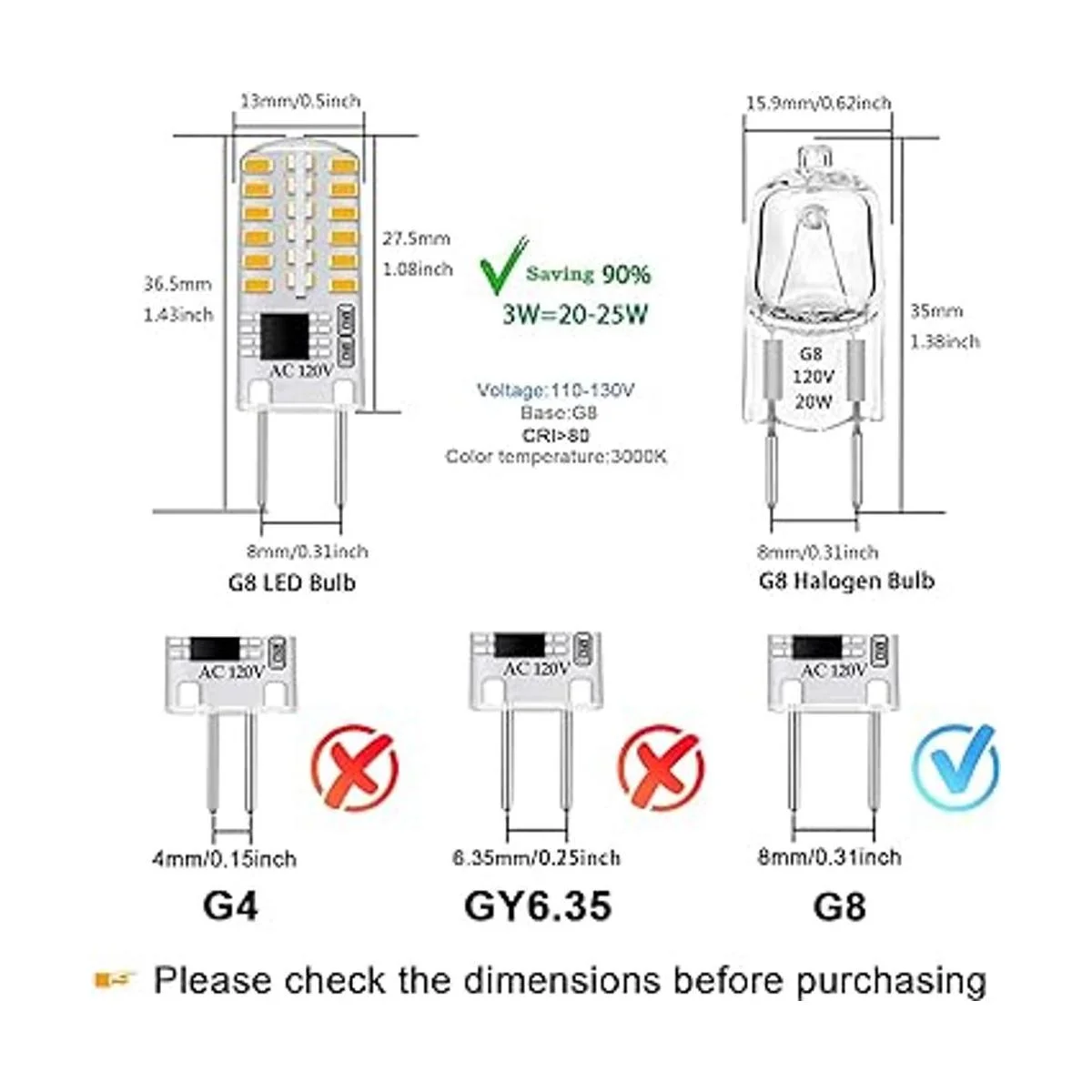 Ahorro de energía y respetuoso con el medio ambiente: ahorra hasta un 90 en tu factura de energía reemplazando la bombilla halógena G8 de 20 W a 25 W con esta bombilla LED G8 de 3 W. Puede funcionar de forma segura a CA 110 voltios, CA 120 voltios, CA 130 voltios. Sin plomo ni mercurio, sin radiación UV o IR. Certificado con CE y RoHS.