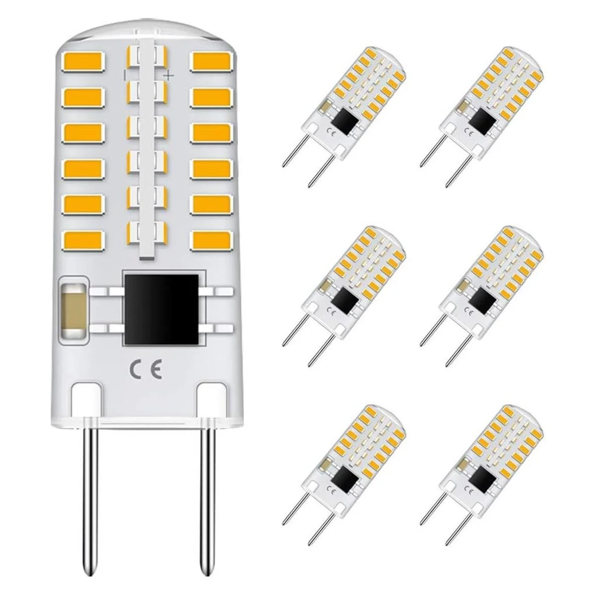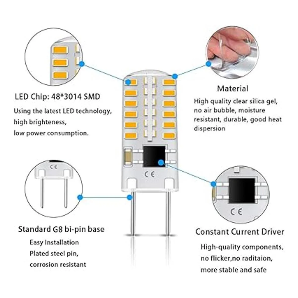 Excelente rendimiento: bombilla LED G8 sellada herméticamente con gel de sílice transparente, resistente a la humedad, ángulo de luz de 360 grados, blanco cálido 3000 K, 270 lúmenes, 48 piezas SMD 3014 en el interior, base G8 de dos pines, fácil de instalar, patrón de luz igual que las bombillas halógenas.