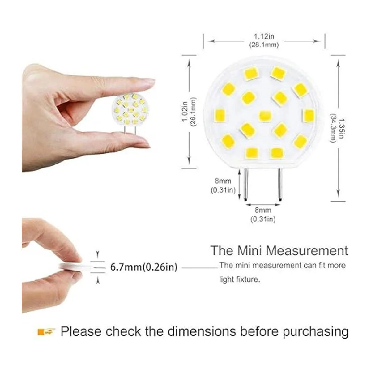 Tamaño mini y fácil instalación: bombilla LED G8, altura: 0.25 pulgadas; diámetro: 1.12 pulgadas; longitud: 1.35 pulgadas, forma plana, diseño de base súper delgada para adaptarse perfectamente a la luz del disco. Base G8 estándar de dos pines, plug and play, reemplaza fácilmente las bombillas halógenas tradicionales T4 Jcd tipo G8.