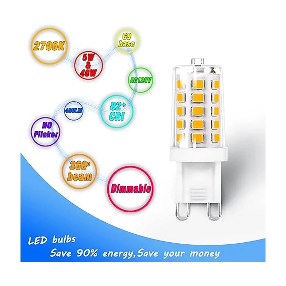 Bombilla LED G9 regulable de 5 W 2700 K suave blanco cálido, reemplaza G9 equivalente a halógeno de 40 W, AC120 V G9 Bipin Base LED para lámpara de araña, 0100 regulable, sin parpadeo, 400 lm paquete de 6