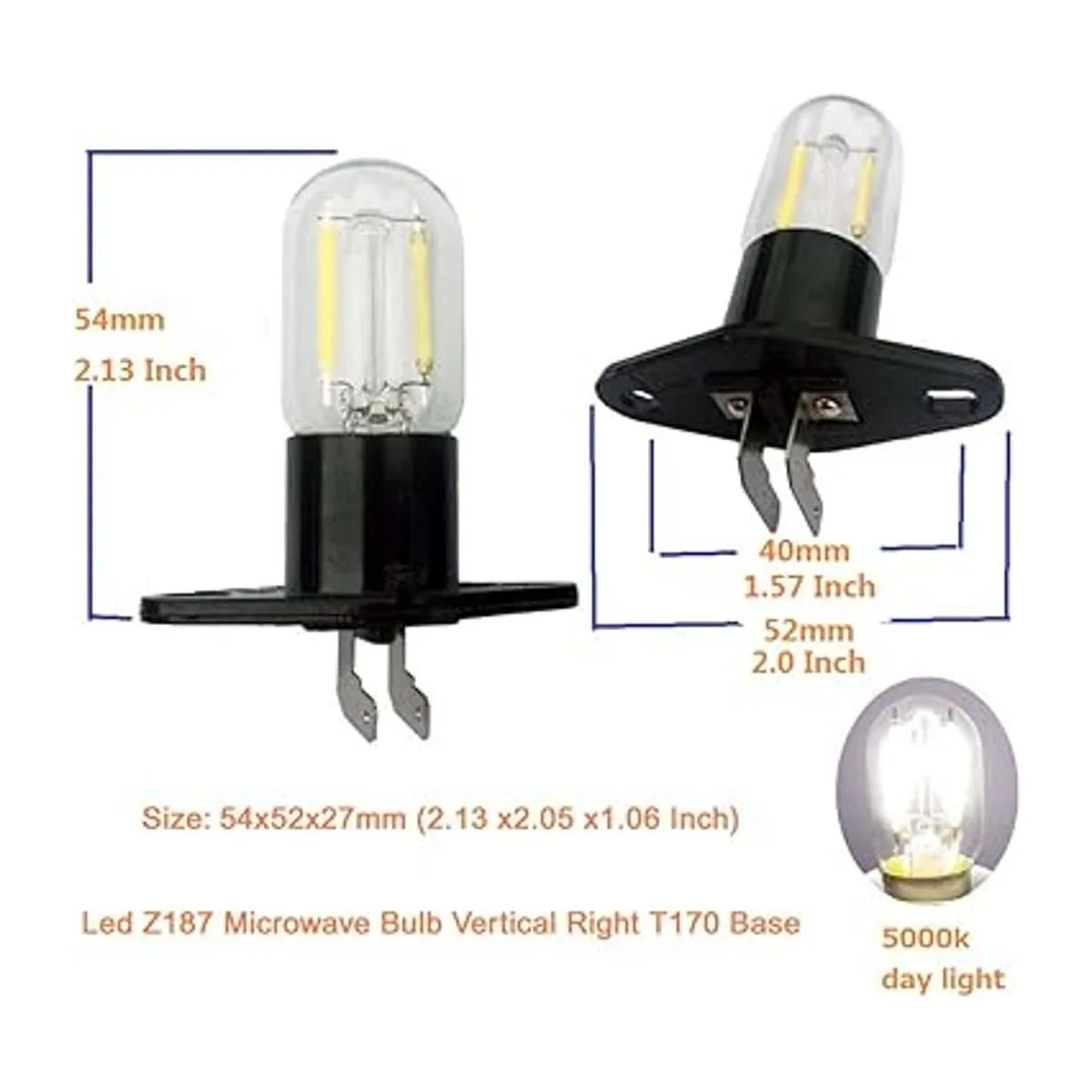 Z187 Bombilla de microondas vertical derecha T170, base 2 A, 250 V máximo, 1,5 W, bombilla LED de filamento equivalente a 20 W, 125 V, tamaño 2.126 x 2.047 x 1.063 in, 5000 horas, luz diurna de 5000 K