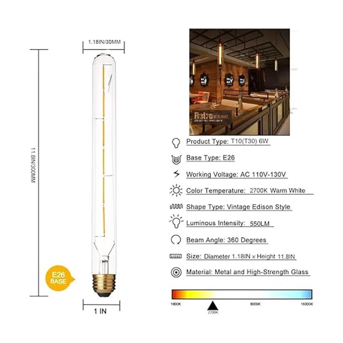Características técnicas: bombilla tubular de filamento LED regulable, base mediana E26, tamaño: 11.8 x 1.2 pulgadas, CA 110 V130 V, con protección contra sobrecarga, protección contra cortocircuitos y protección contra sobretemperatura, ángulo de haz de 360 grados y menos calor.