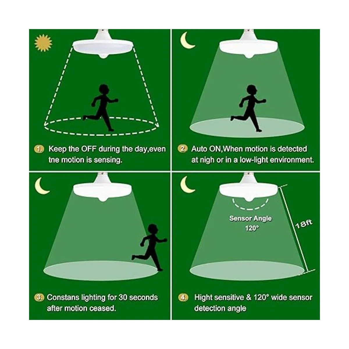 Sensor de movimiento PIR incluido: el sensor infrarrojo PIR de alta calidad se instala en la punta de la bombilla, por lo que la bombilla del sensor de movimiento se iluminará automáticamente mientras detecta movimiento dentro de 1316 pies en la oscuridad, y se apagará automáticamente después de que el movimiento cese o desaparezca unos 30 segundos.