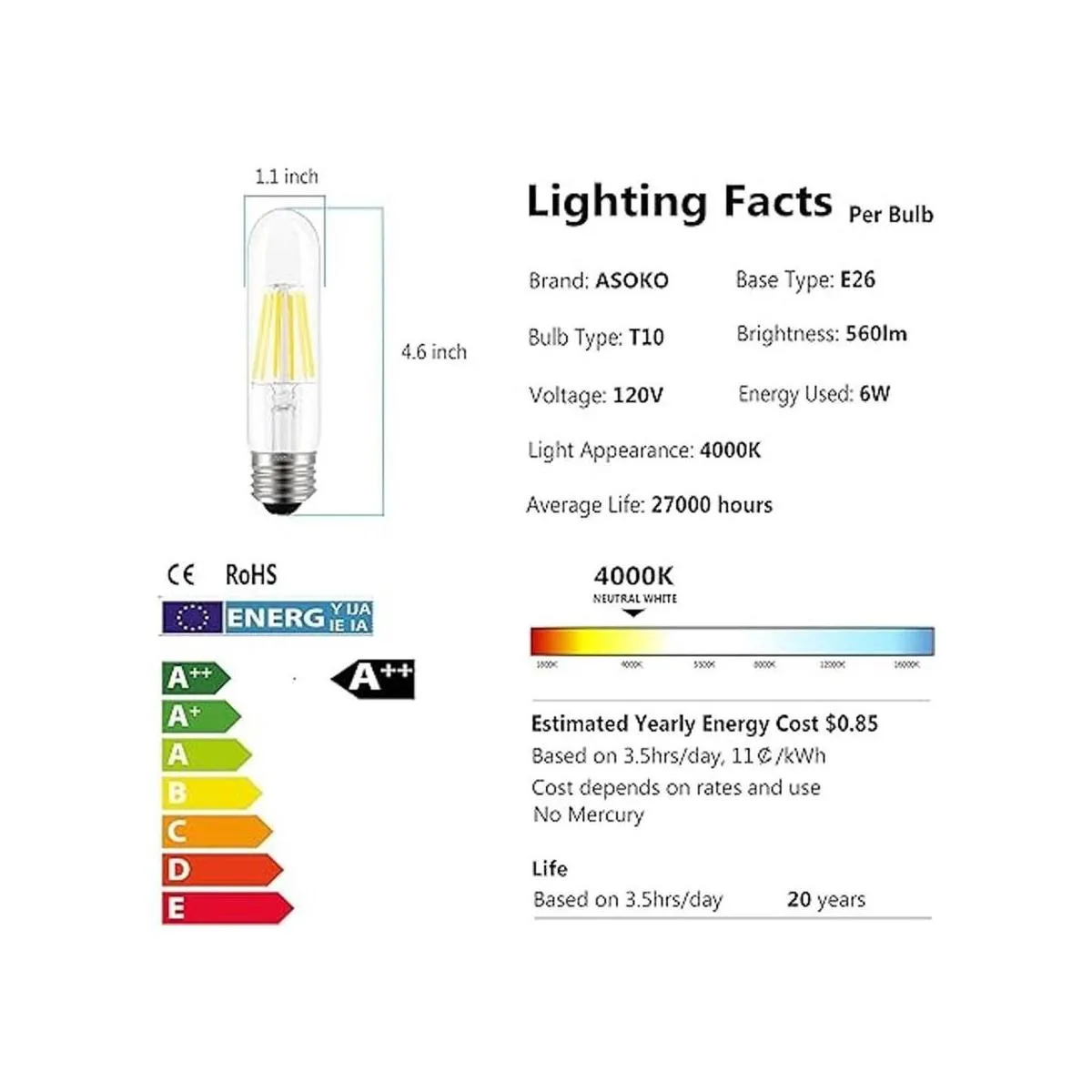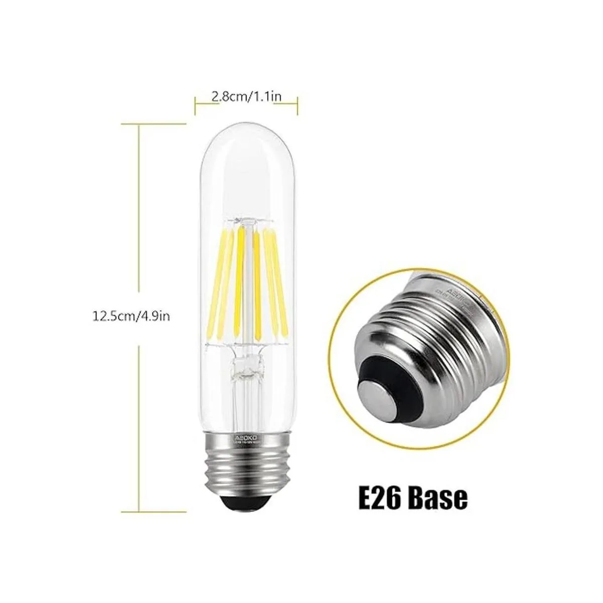 Bombillas E26 T10 de luz blanca de día de 6 W, bombilla Edison T10 regulable de 60 vatios 4000 K, bombillas tubulares LED de base E26, tubo ASOKO Bombilla LED vintage Edison para lámpara de escritorio, luces colgantes, hogar paquete de 3