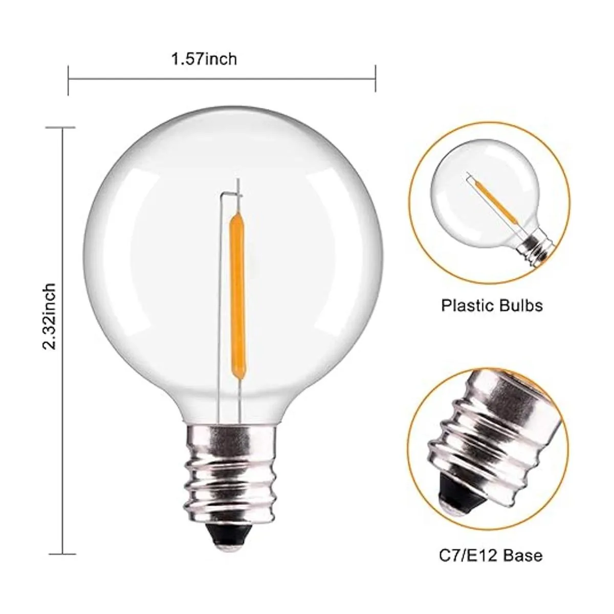 Bombillas LED de repuesto G40, bombillas de plástico inastillables de 1.57 pulgadas, bombillas de globo regulables de 0.6 W, para base de candelabro E12C7 para decoración de cadena de luces de interior y exterior, color blanco cálido, paquete de 25