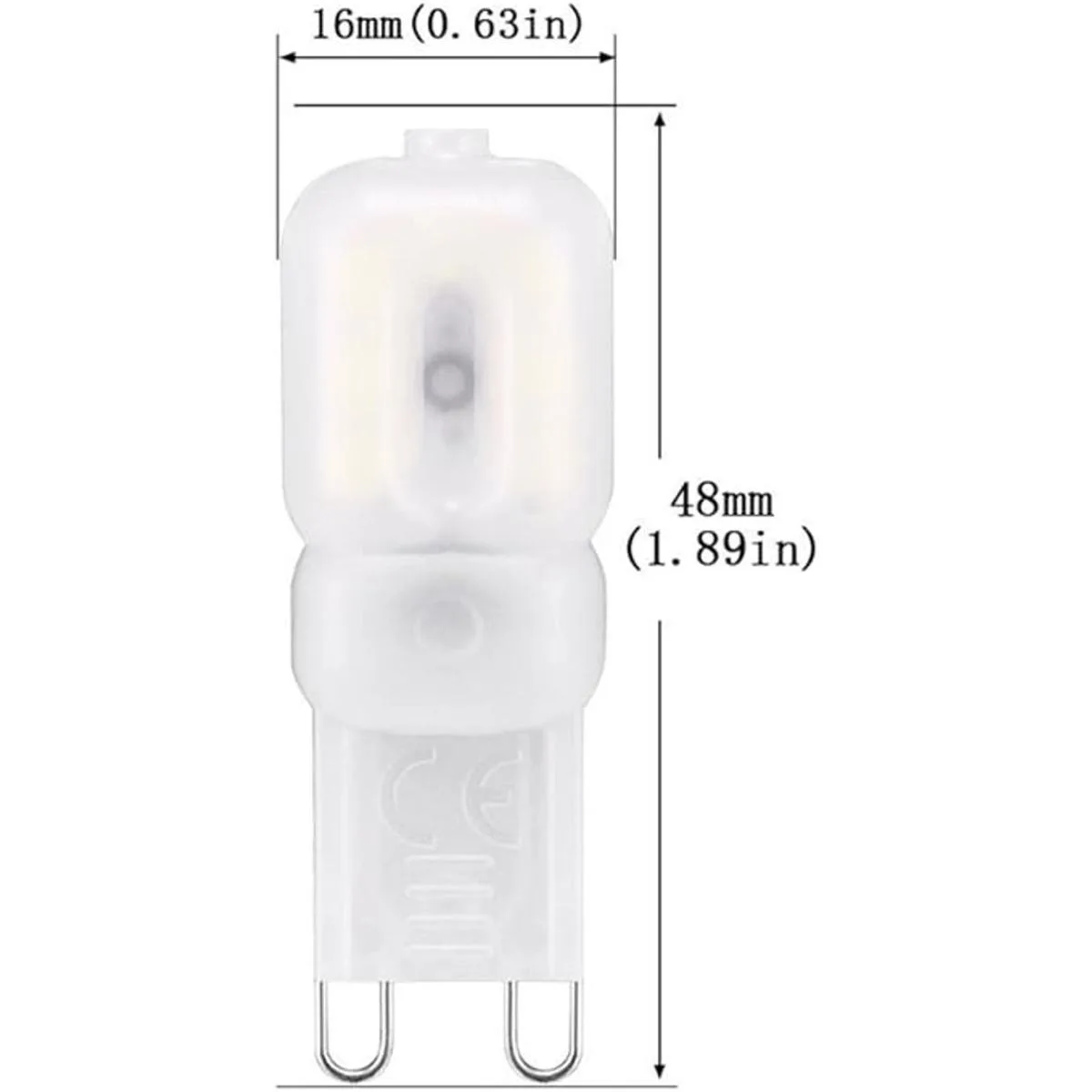 Tamaño del producto: 0.630 x 1.890 in. Enchufe estándar G9 de dos pines. Fácil de instalar, plug and play, simplemente reemplaza la lámpara halógena tradicional