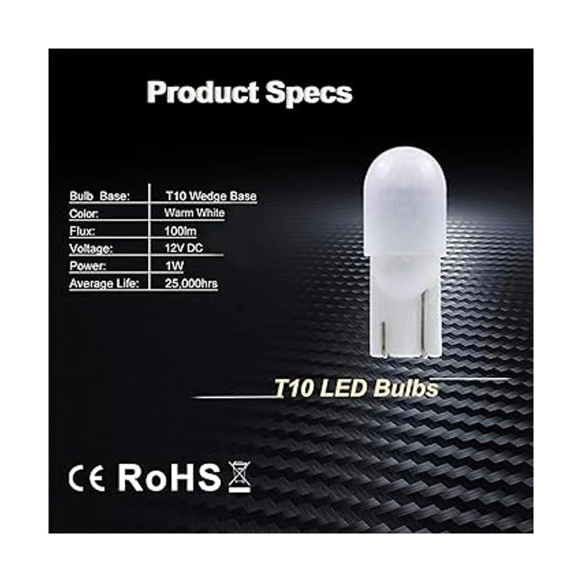 Especificaciones de la bombilla: tamaño de la bombilla: 0.472 in x 1.457 in alto, 1 W, 2700 K blanco cálido, 12 V CC, 100 lm, CRI 80, base de cuña miniatura T10, no regulable. Tamaño de la bombilla: T10, 168, 194 147, 152, 158, 159, 161, 175, 184, 192, 193, 2825