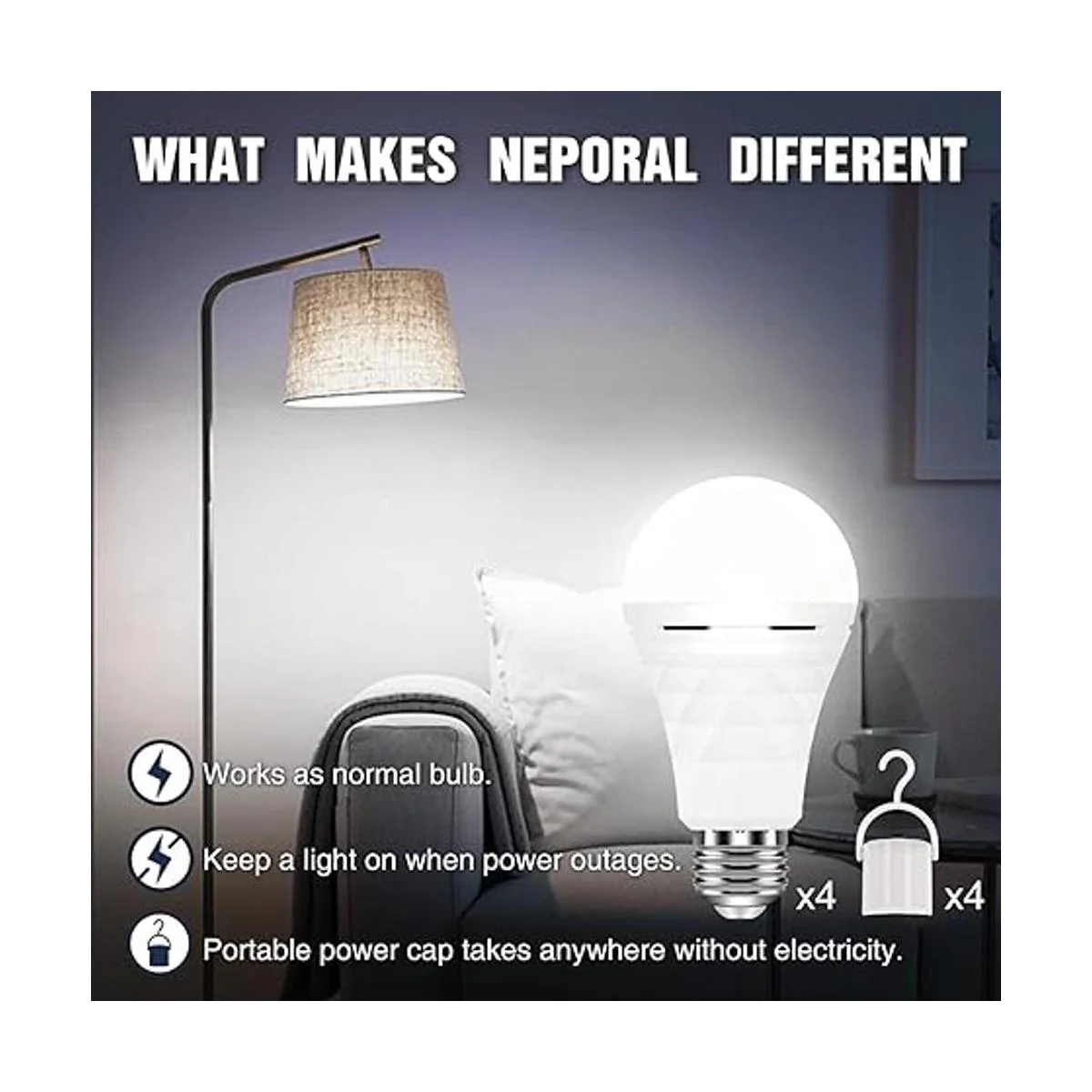 Lo que obtienes: 4 paquetes de bombillas LED recargables de emergencia Neporal y 4 tapas de alimentación portátiles. 2 años de garantía y servicio al cliente 24/7. Sin radiación, 80 ahorro de costos de electricidad, 100 respetuoso con el medio ambiente.