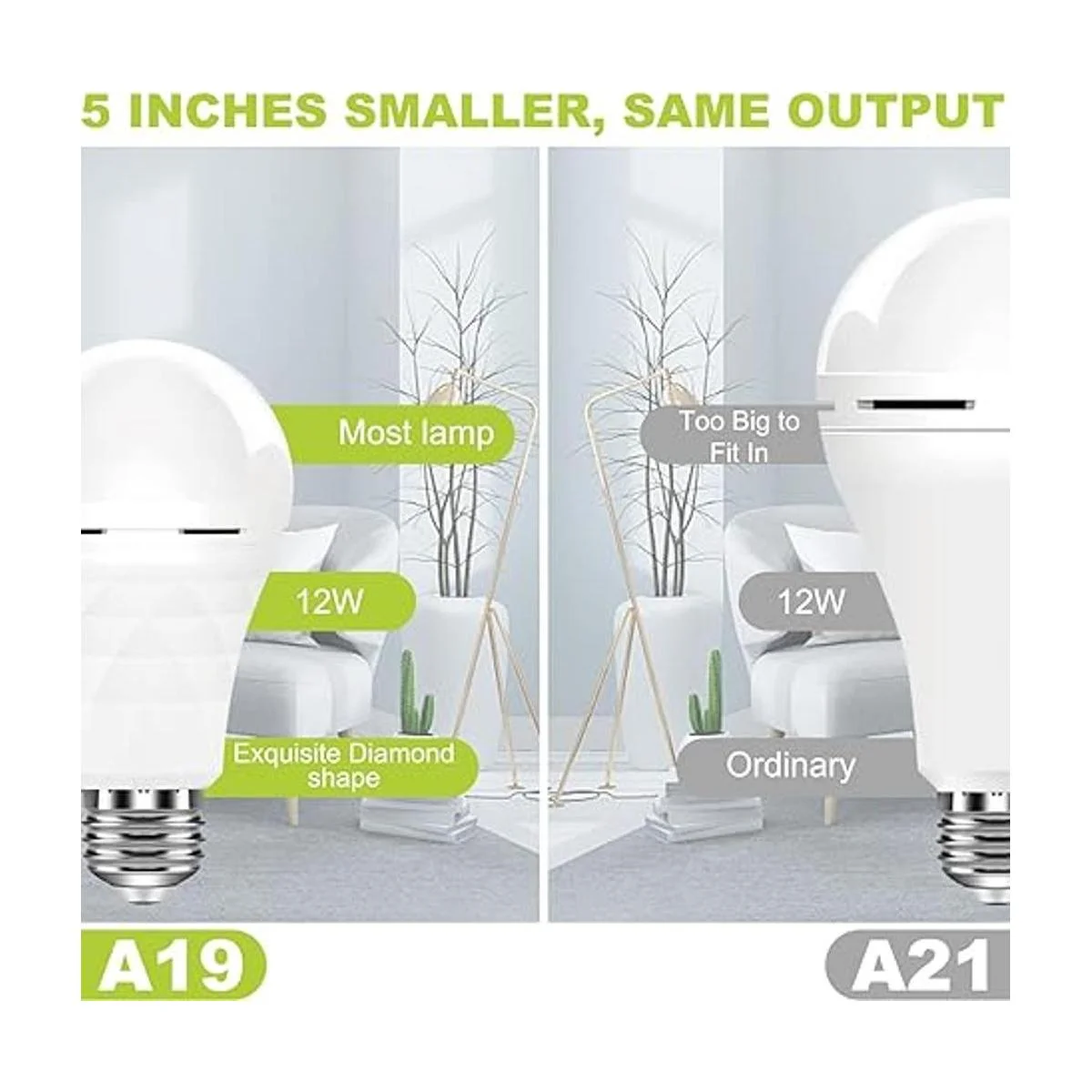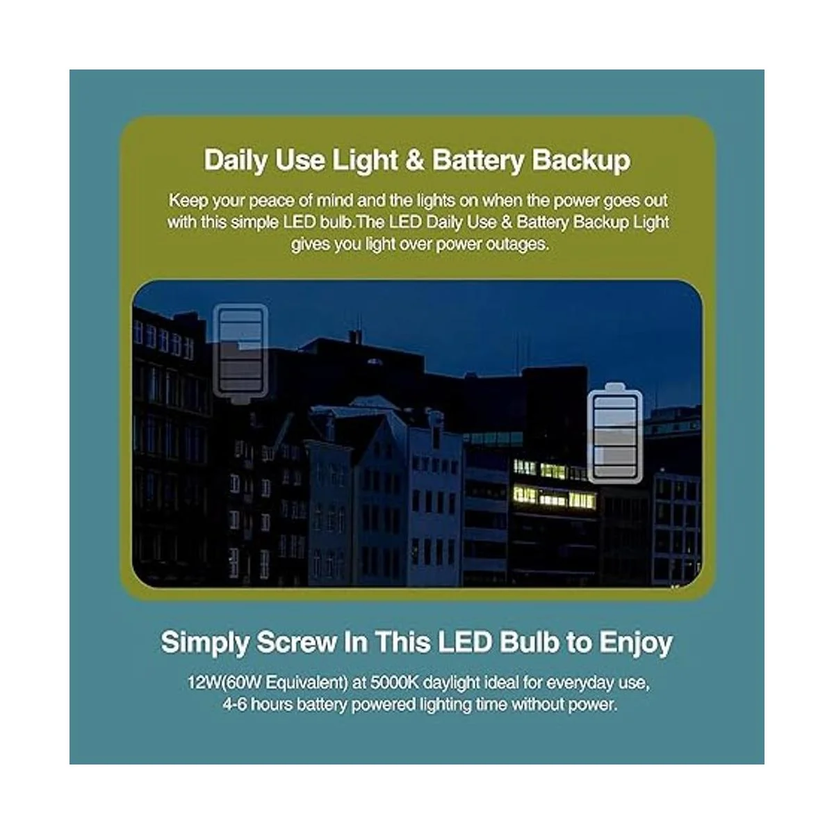 Fácil de usar y de alta aplicabilidad: equivalente a 60 vatios luz diurna de 5000 K es la opción más popular para el uso diario en casa. La bombilla de tamaño A19 tiene una mayor aplicabilidad para la mayoría de lámparas con enchufe E26 o E27. Simplemente atorníllalos en el enchufe y listo. Otras bombillas de emergencia en el mercado son a menudo grandes en tamaño que pueden no caber en tu lámpara. Esta es como la bombilla tipo A normal, perfecta para cualquier lámpara, como lámpara de pie, lámpara de escritorio, lámpara de mesa, lámpara de techo, etc.