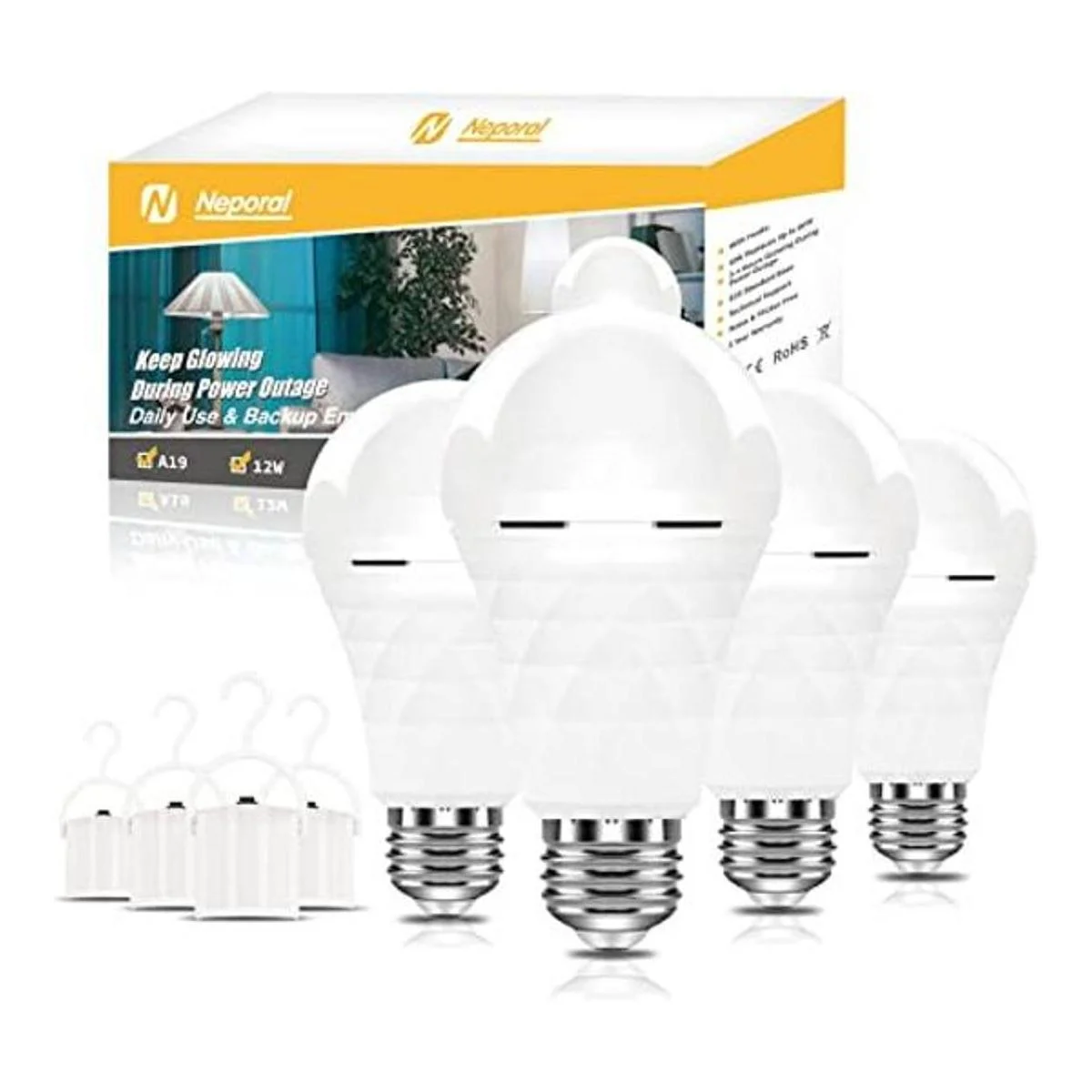 Luces de emergencia para fallos de alimentación del hogar: las bombillas recargables Neporal funcionan como bombillas LED A19 normales y se pueden cargar automáticamente cuando se usa a diario. Cada bombilla de emergencia incorpora batería de reserva de 1200 mAh, puede proporcionar iluminación durante 46 horas sin electricidad durante el corte de energía. Diseño de paquete combinado de 4 para necesidades de iluminación de 2 a 4 días.