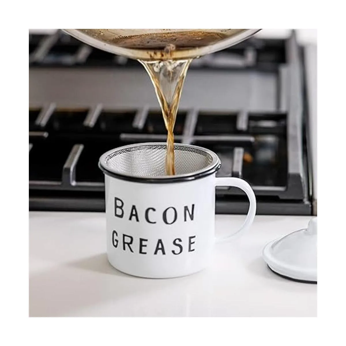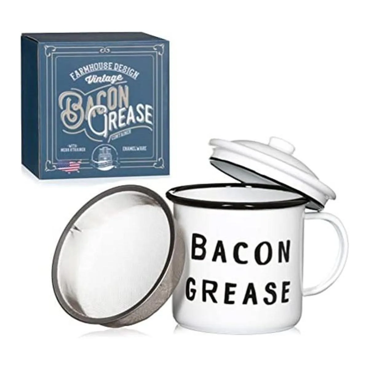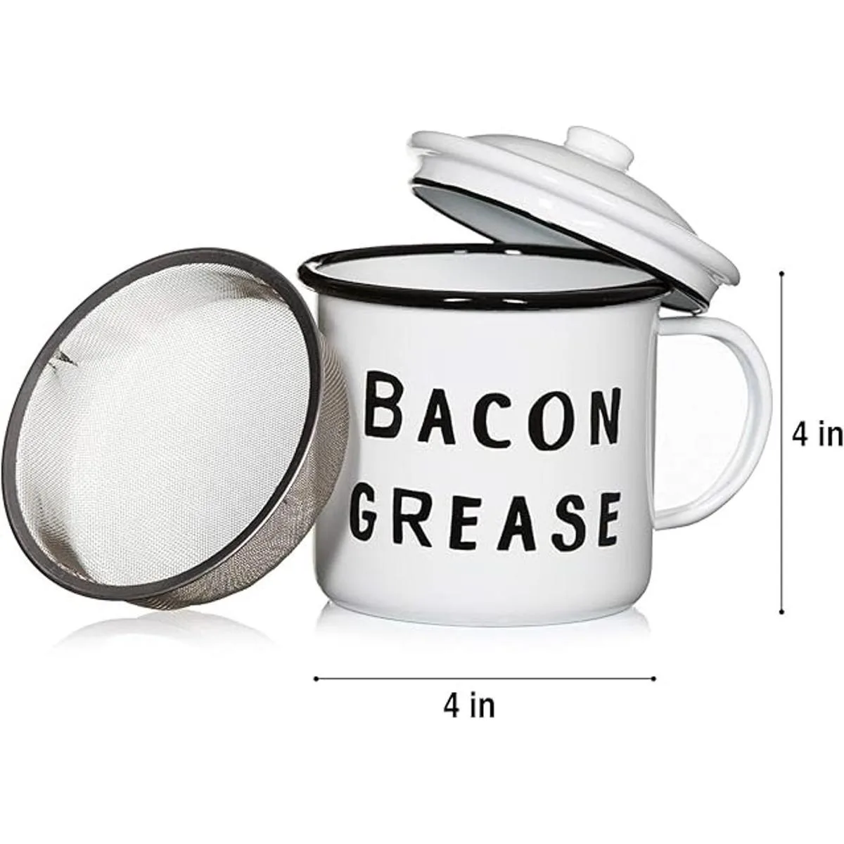 Bonito recipiente de grasa de tocino con colador de malla, diseño rústico moderno de mediados de siglo, esmalte blanco sobre metal, esmalte vintage de 4 x 4 pulgadas con tapa negro