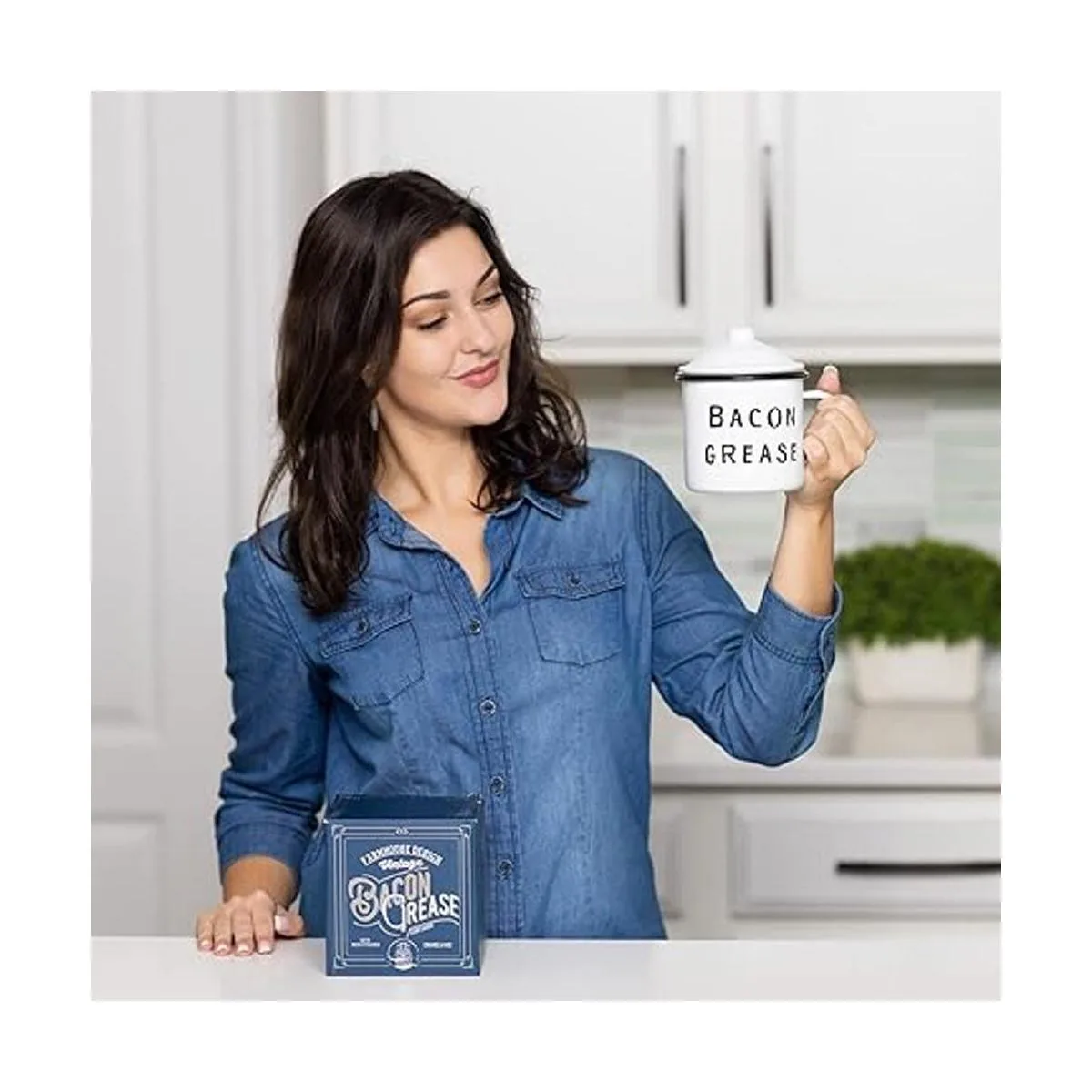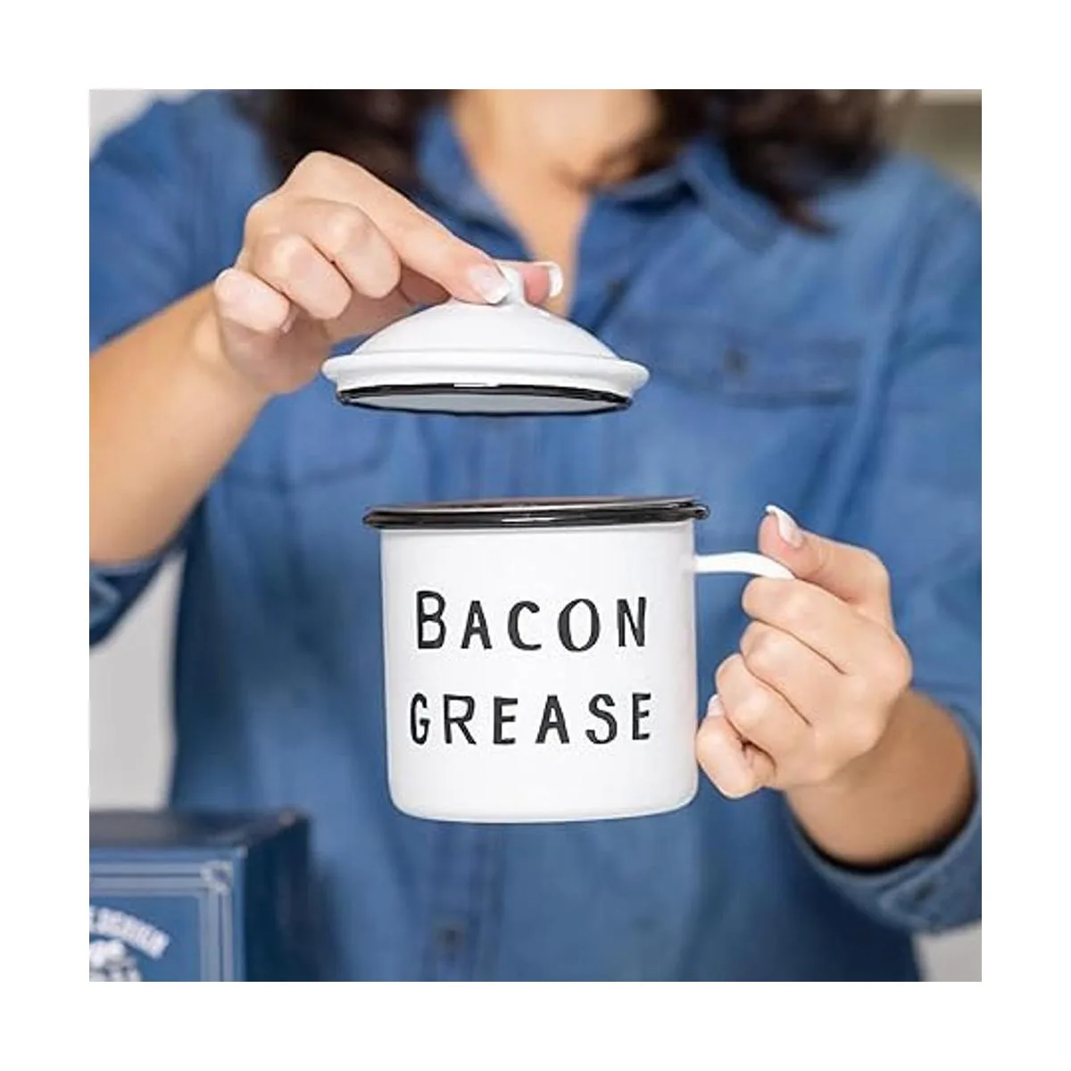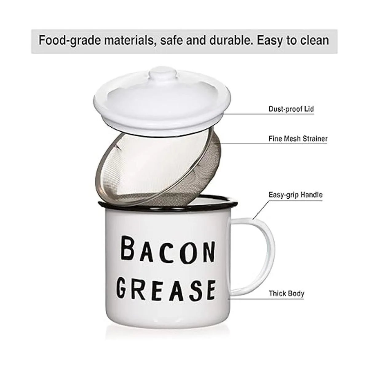 Estilo estético simple: este recipiente de tocino combina perfectamente con la esencia rústica de mediados de siglo. El simple recipiente de metal esmaltado blanco con texto negro añade un aspecto elegante a tu cocina. Cottagecore