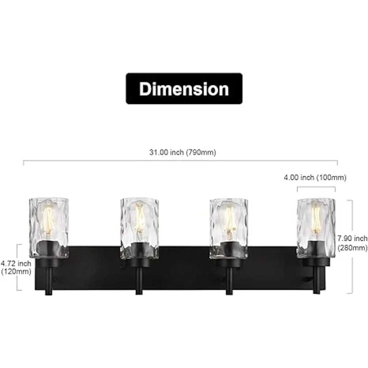 1Diseño moderno y único: esta lámpara de tocador de pared de 4 luces tiene pantallas de vidrio martillado transparente y un acabado rico que crea un aspecto de granja en tu espacio. Las pantallas de vidrio aportan una sensación vintage refinada a cualquier habitación y un acabado de metal simple pero elegante con pantallas de vidrio martillado transparente se presta a colocarla en un baño, entrada o comedor, aportando un ambiente moderno de granja al espacio. Se puede montar en posición arriba o abajo.