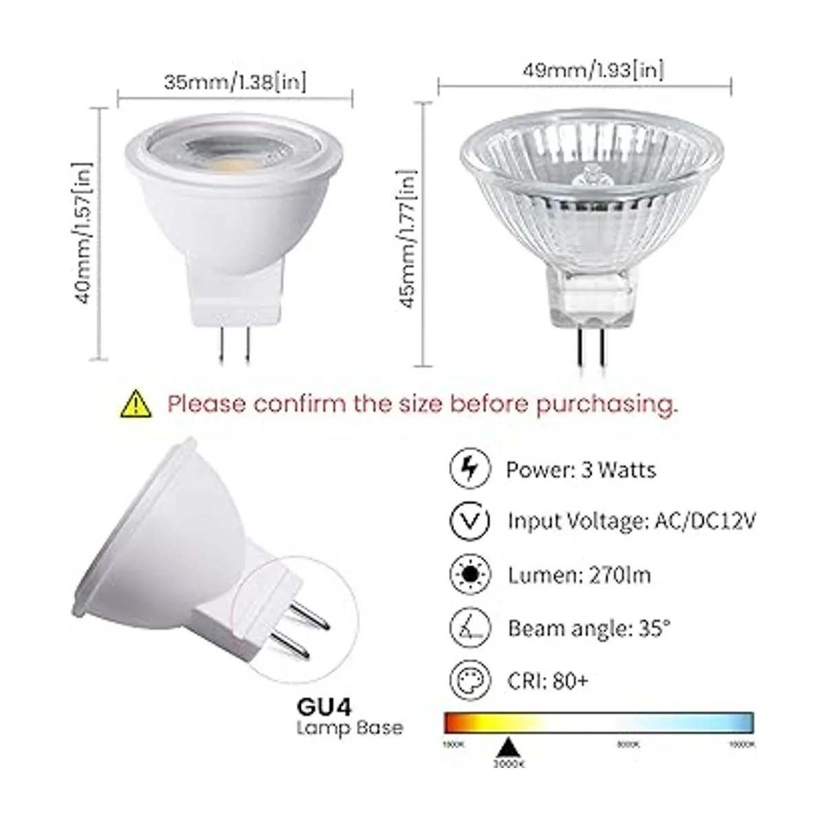 Características técnicas: bombillas LED MR11 GU4.0, 12 V AC/DC, 270 lm, blanco cálido 3000 K, dimensiones: 1.378 in de diámetro, 1.575 in de longitud.