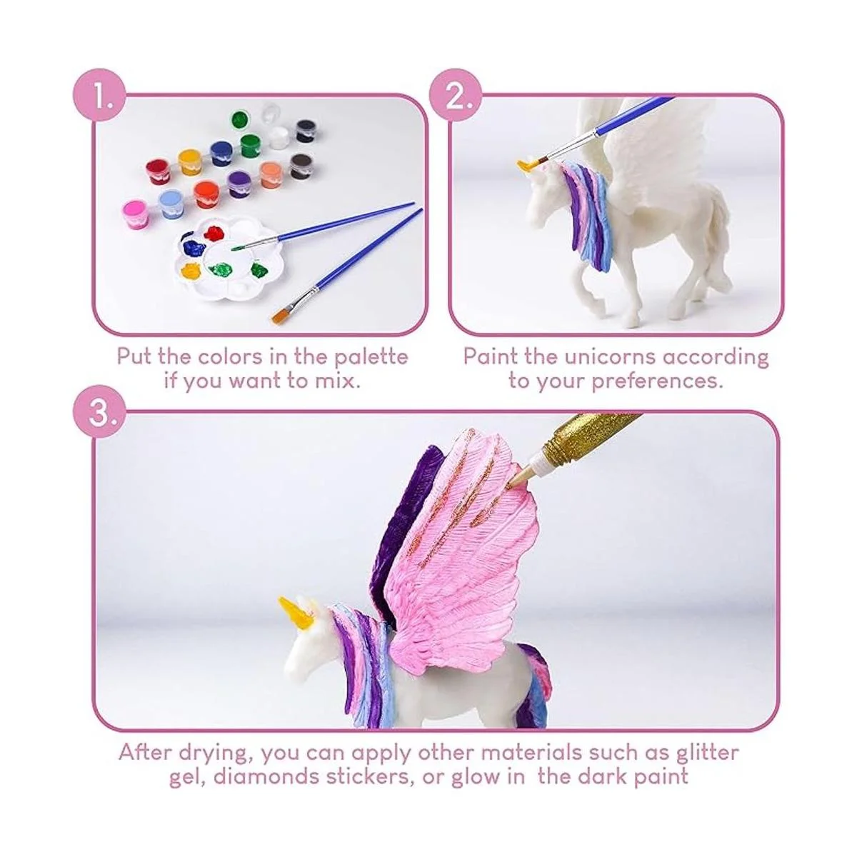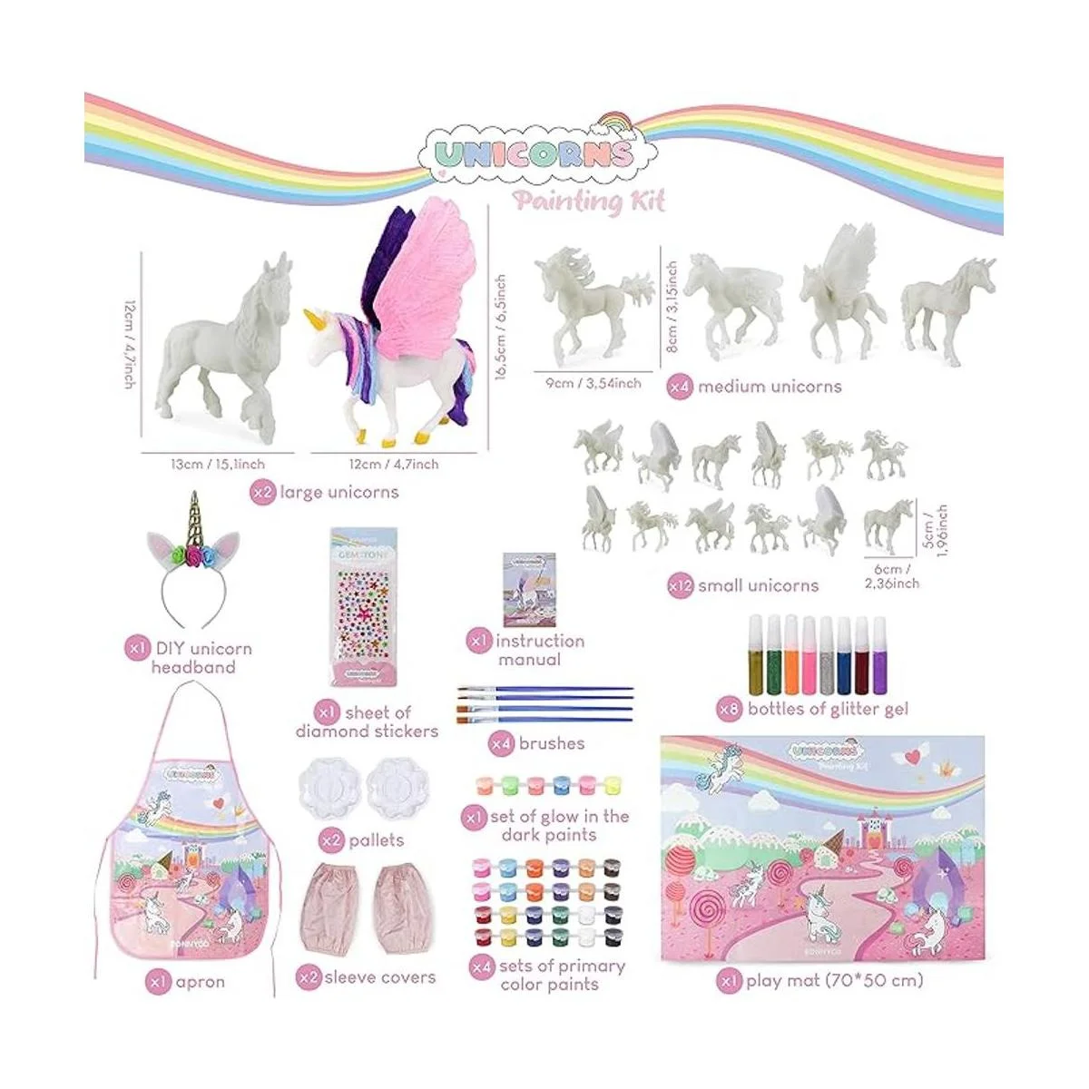 Kit de pintura de unicornio para niños: juego de figuras de unicornio para pintar. Contiene lo siguiente: 2 unicornios grandes, 4 unicornios medianos, 12 unicornios pequeños, 4 juegos de pinturas de color primario, 1 juego de pinturas que brillan en la oscuridad, 2 almohadillas de mezcla de colores, 4 pinceles, 8 tarros de gel con purpurina, 1 hoja de diamantes adhesivos, 1 diadema de unicornio de bricolaje, 1 delantal con 2 fundas de manga, 1 alfombrilla y 1 manual de instrucciones idioma español no garantizado