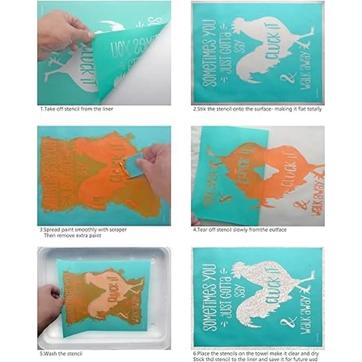 Plantilla adhesiva económica Nuestra plantilla de serigrafía es una transferencia reutilizable y lavable que tiene una parte trasera adhesiva que ayuda a prevenir el sangrado de pintura. Esta plantilla adhesiva de transferencia se puede operar en diferentes superficies con pinturas acrílicas