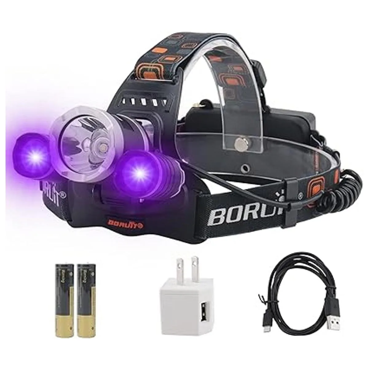 BORUiT RJ3000 LED de luz negra, 3 modos de luz blanca y UV, 5000 lúmenes, recargable de luz negra, lámpara de cabeza para caza, camping, senderismo, pesca y trabajo