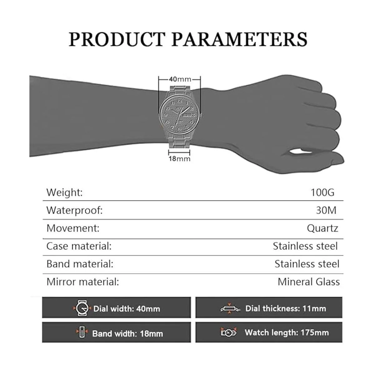 Diseño: este es un exquisito reloj de moda para hombre. Con peso adecuado y superficie lisa, esfera en relieve 3D, es adecuado para uso diario o negocios, ocio o actividades en interiores y exteriores. La correa plateada de acero inoxidable está diseñada con cinco capas de bisagras y una hebilla plegable. Es fácil de llevar y ajustar, es extremadamente duradero y puede durar la vida útil del reloj analógico con el cuidado adecuado.