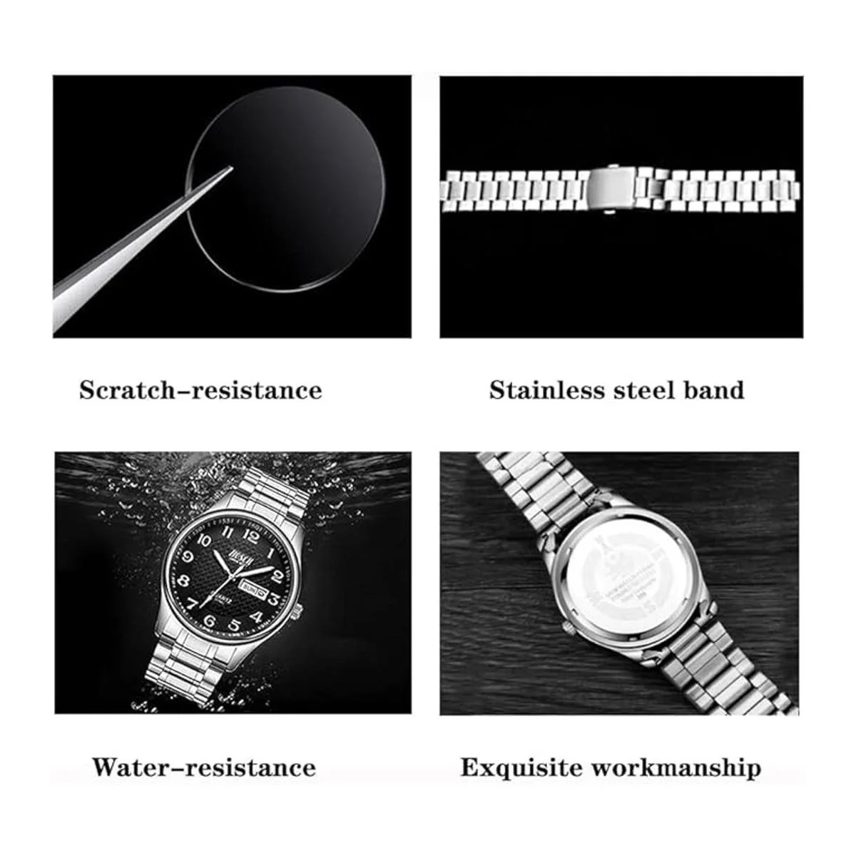 Material: el espejo del reloj para hombre está hecho de vidrio mineral de alta resistencia, y la caja y la correa están hechos de acero inoxidable plateado brillante con decoración dorada opcional. Todos ellos son de alta resistencia al desgaste, resistencia a los arañazos y resistencia a altas temperaturas. Después de un uso a largo plazo, todavía no se desvanecen y se ven como nuevos.