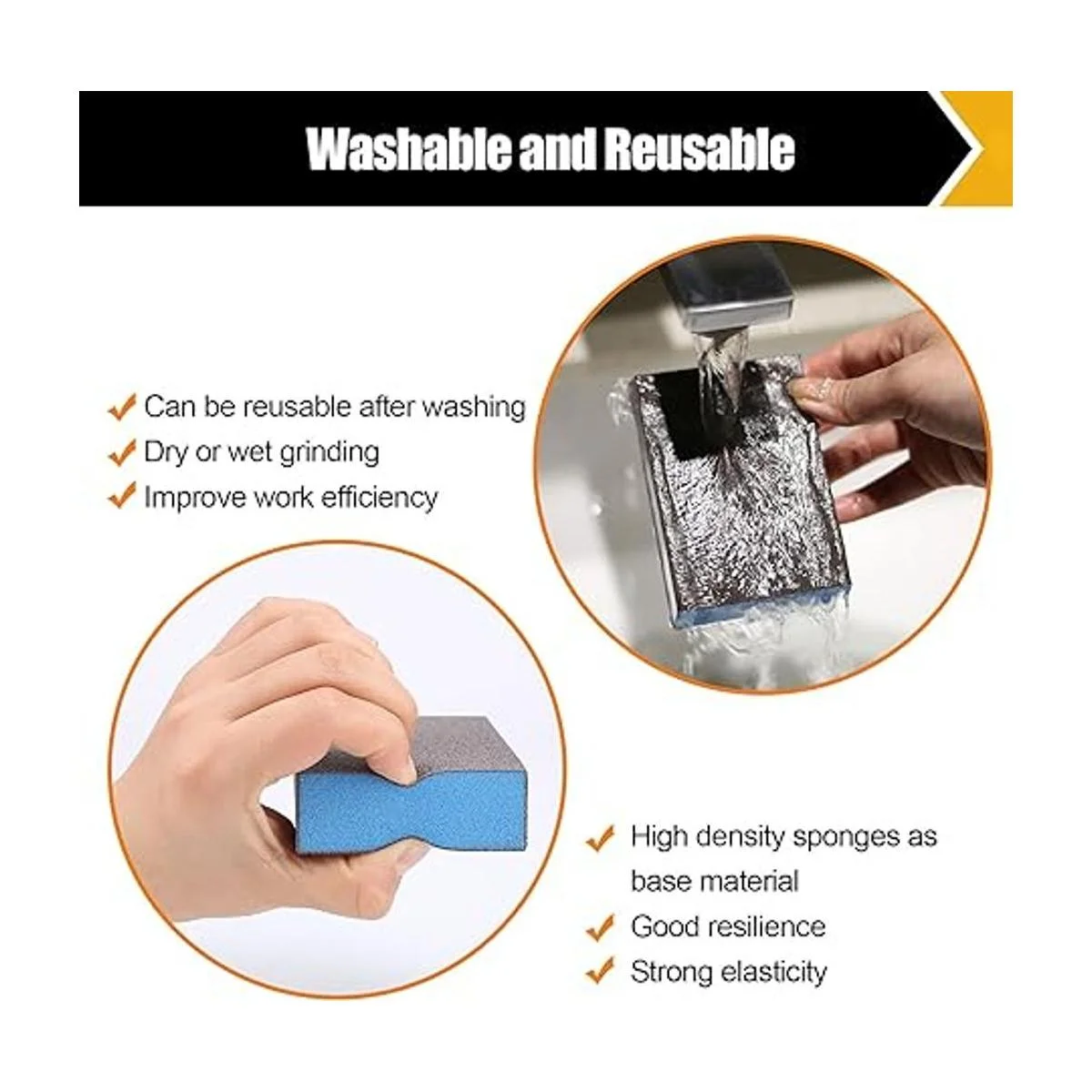 Bloque de papel de lija lavable y reutilizable: las esponjas de lijado en seco y húmedo reducen el lavado y aumentan la eficiencia del trabajo debido a su función de almacenamiento de agua. Se puede utilizar directamente o húmedo en la superficie del objeto para pulir.
