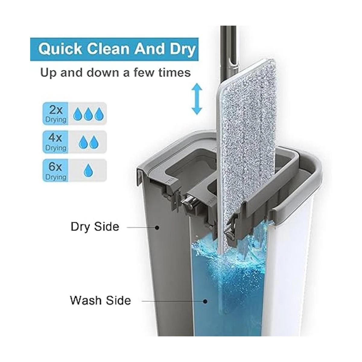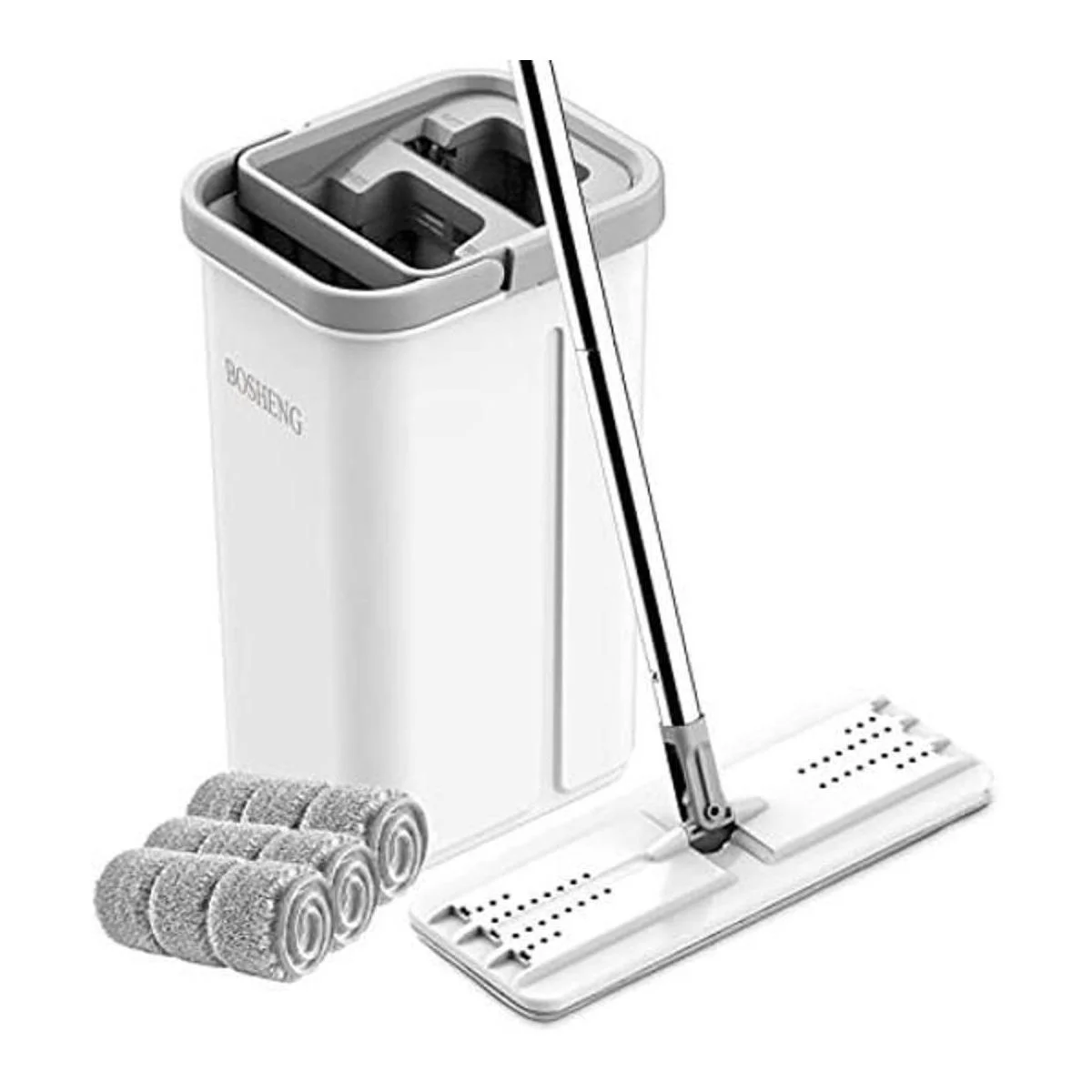 BOSHENG Juego de trapeador y cubeta con escurridor, trapeador plano manos libres y cubo, 3 almohadillas de microfibra lavables incluidas, uso húmedo y seco, sistema de limpieza de suelos para todo tipo de suelo y ventanas
