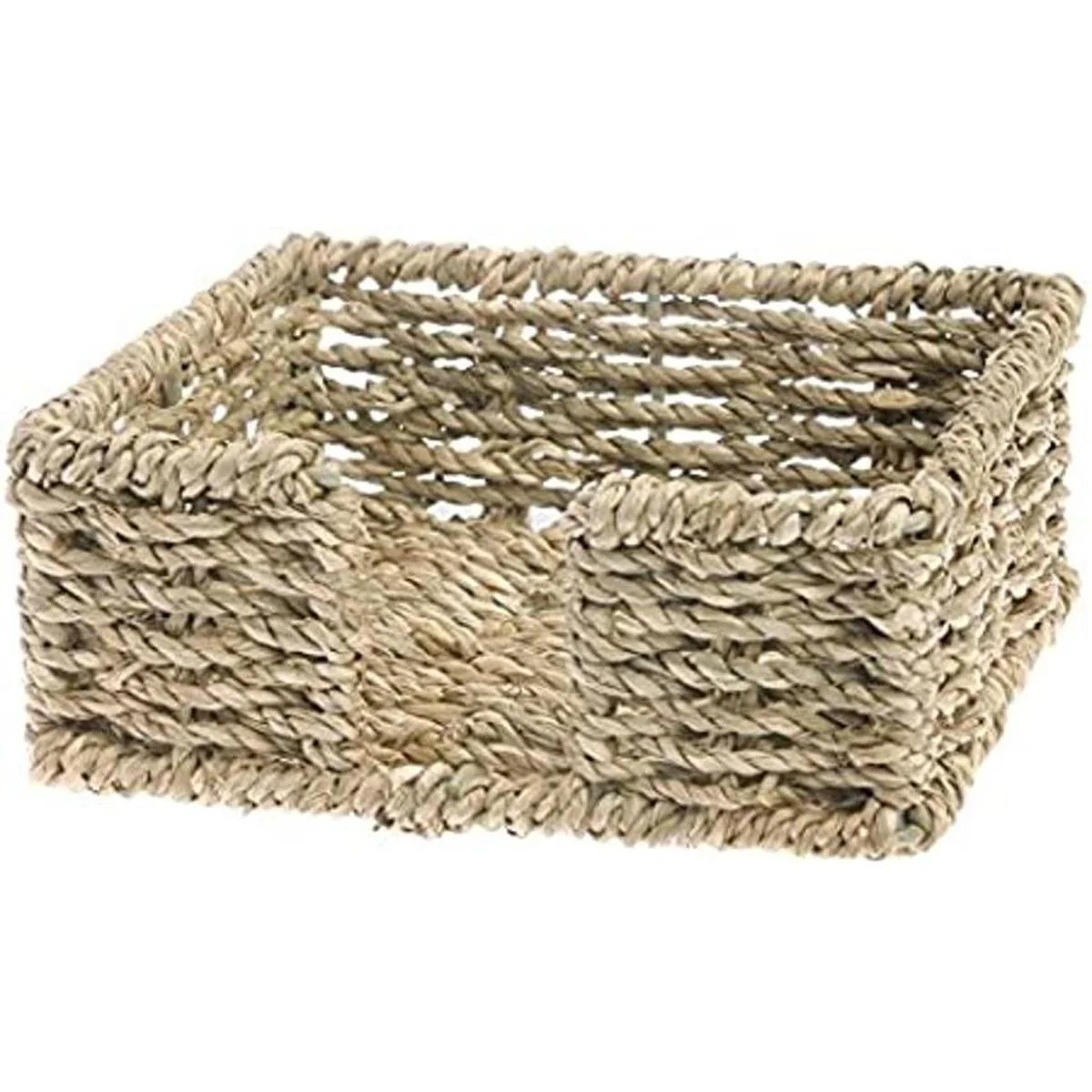 Busca una cesta de almacenamiento para servilletas de hierba marina, una cesta para servilletas de invitados, y una cesta para patatas fritas y salsas.