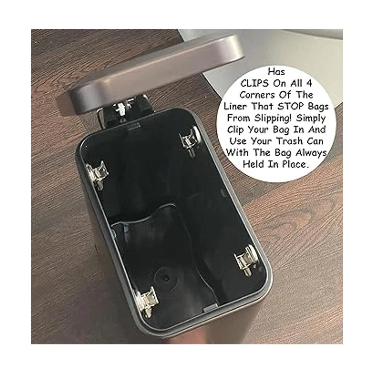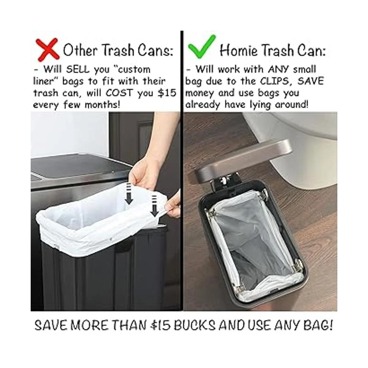 Ahorra más de 15 en no tener que comprar bolsas de forro personalizadas para adaptarse a tu cubo de basura. Utiliza cualquier vieja bolsa barata tumbada. Cualquier bolsa se adapta perfectamente al contenedor y se mantiene oculta en el interior, el cubo de basura es de 1.3 galones