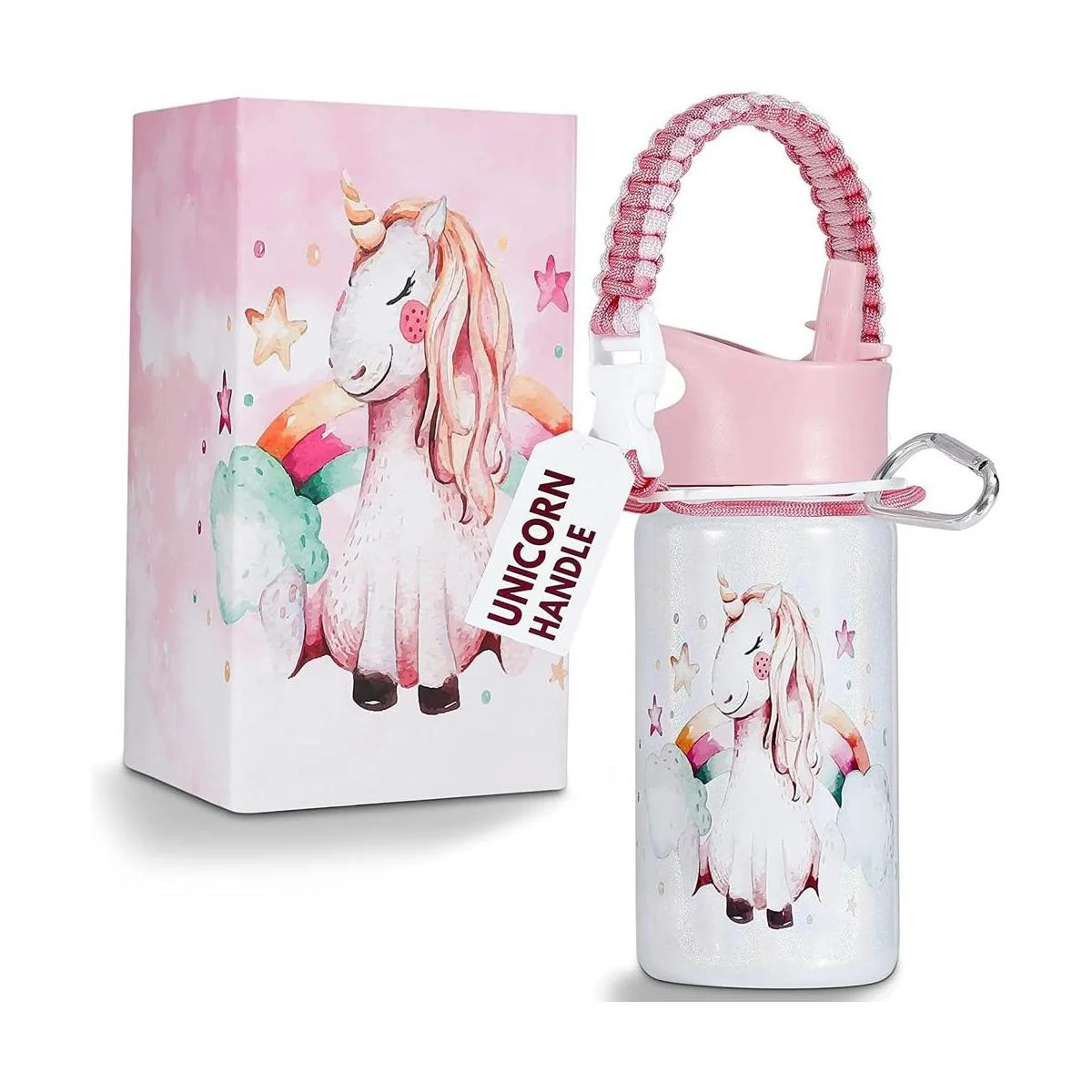 Botella de agua de unicornio, a prueba de fugas, 14 onzas, termo escolar para niñas, botella blanca con tapa rosa, mango de unicornio rosa y lindo unicornio para niños, Arctic North