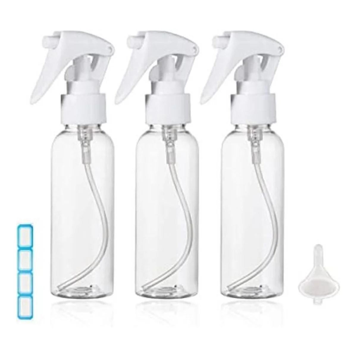 Botella de spray de tamaño de viaje, 3.4 oz3.4 fl oz de plástico de niebla fina, recipientes de líquido rellenables, 3 unidades de pulverizador de disparador transparente con embudo y etiquetas para peinar cocina, limpieza de oficina en el hogar
